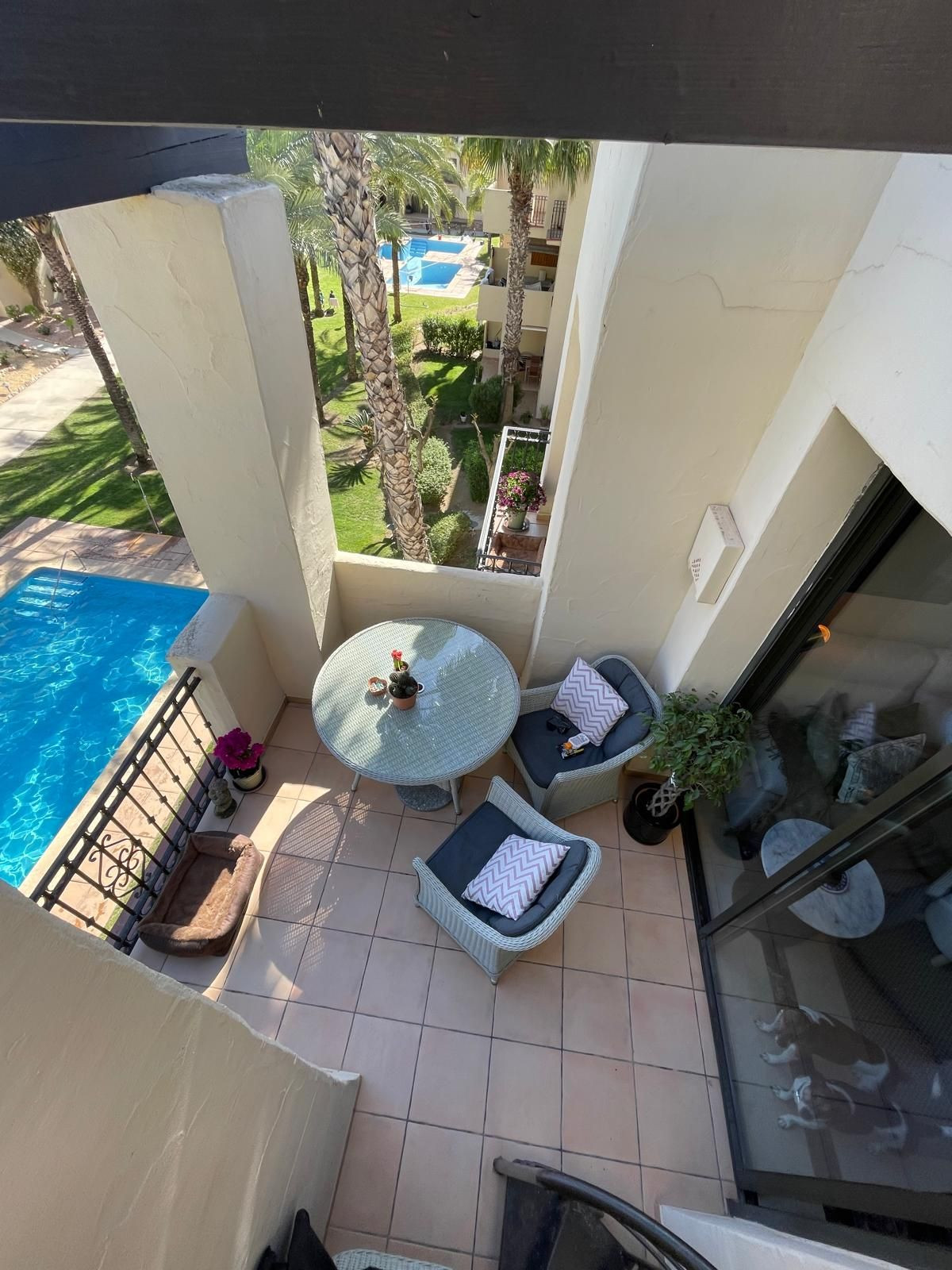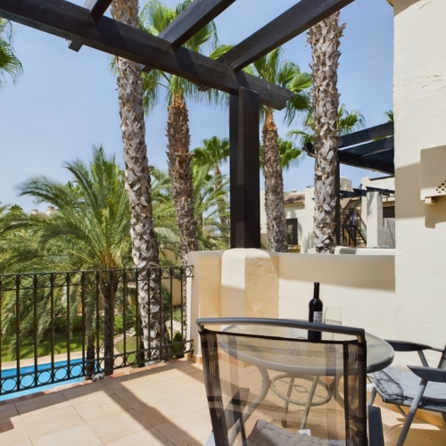 Inside, you'll find elegant marble flooring throughout, with the en-suite and main bathrooms showcasing floor-to-ceiling marble. Conveniently located near the Club House and main entrance, the property allows for easy access to local amenities and the Mar Menor beach. The apartment features built-in wardrobes in the master bedroom, which includes an en-suite with a walk-in shower, and a fully equipped kitchen on the lower level.