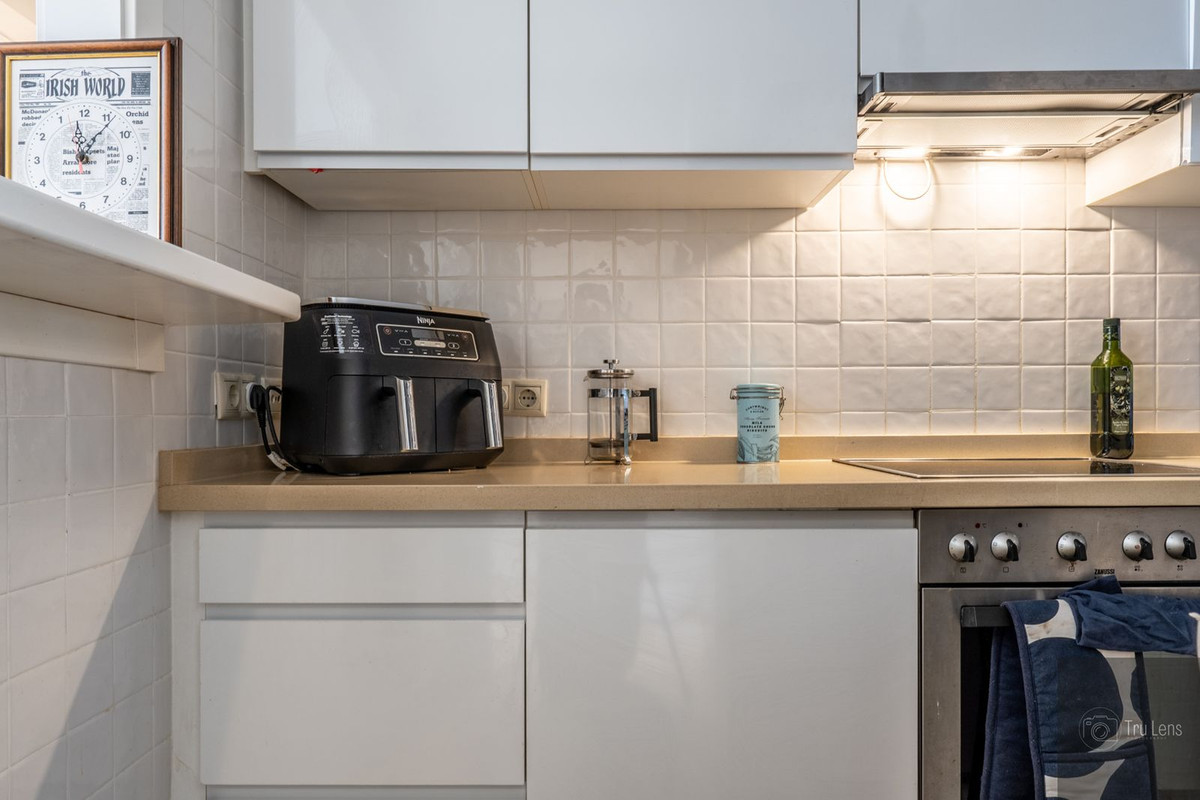 The bright and spacious lounge/dining area and master bedroom both extend to a good-sized terrace and Juliette balcony, presenting lovely views of the well-maintained communal gardens and swimming pools. This inviting property comes with negotiable furniture, air conditioning, and gas central heating throughout. Additional amenities include underground parking and a storage room with lighting.