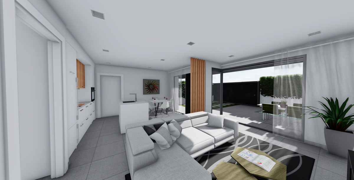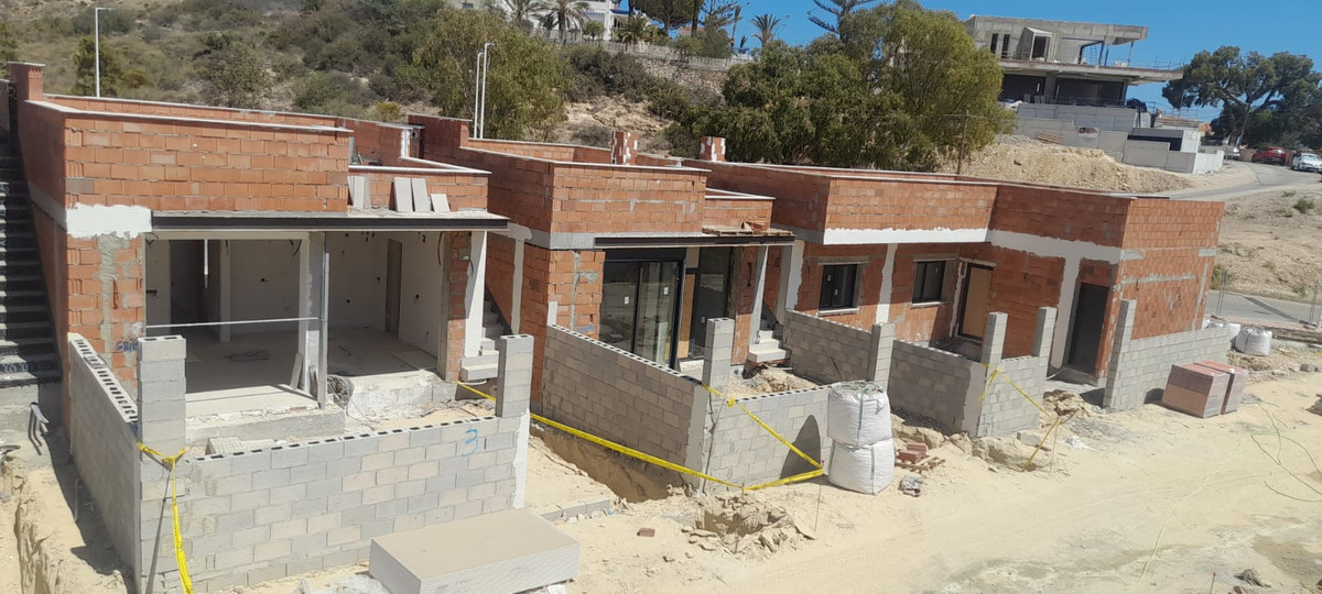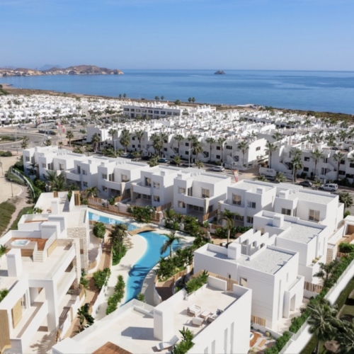 26 moderne uafhængige villaer i stueetagen med solarium og privat pool, med 2 og 3 soveværelser, 400 meter fra strandene.