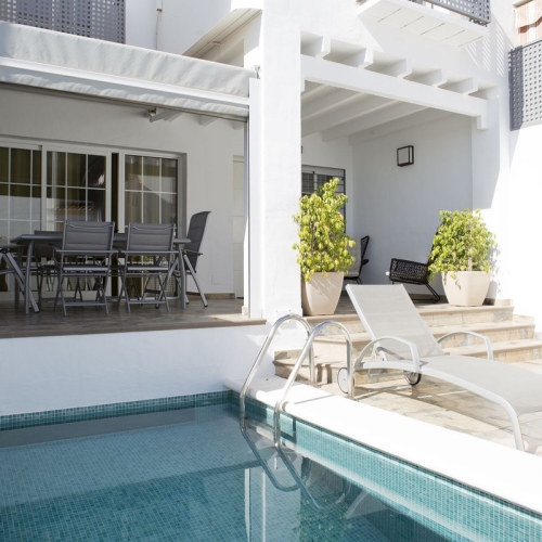Smukt rækkehus i Punta Lara (Nerja) på 3 etager. Hovedhuset er i 2 etager og har 2 store soveværelser, 1 badeværelse, rummelig stue med balkon og fuldt udstyret køkken. Der er en stor sydvendt tagterrasse med panoramaudsigt over havet og bjergene, med pergola, spiseplads, vand- og el-tilslutning, grill og flere opbevaringsrum. Den underbyggede af huset er blevet omdannet til et selvstændigt studie med udstyret køkken og badeværelse og separat indgang.