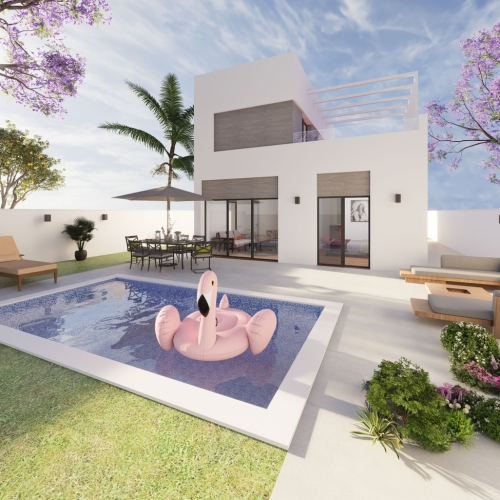 I den charmerende by Rojales præsenterer vi en spektakulær udvikling af ti nybyggede hjem, hver med et moderne og minimalistisk design. Disse ejendomme, med en arkitektonisk stil der kombinerer funktionalitet og æstetik, tilbyder en luksuriøs og komfortabel boligoplevelse i et roligt og indbydende miljø.
