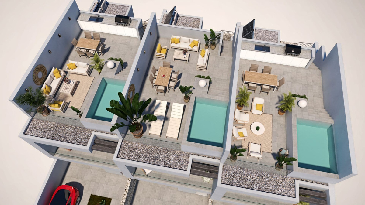 Dette duplex skiller sig ud med sit udvendige design, en kombination af rene linjer og belagte elementer, der giver dette strandhus en unik, moderne og elegant stil. Med sydøstlig orientering og beliggende i et etableret boligområde, gør det det ideelle hjem for at nyde det mediterrane liv.
