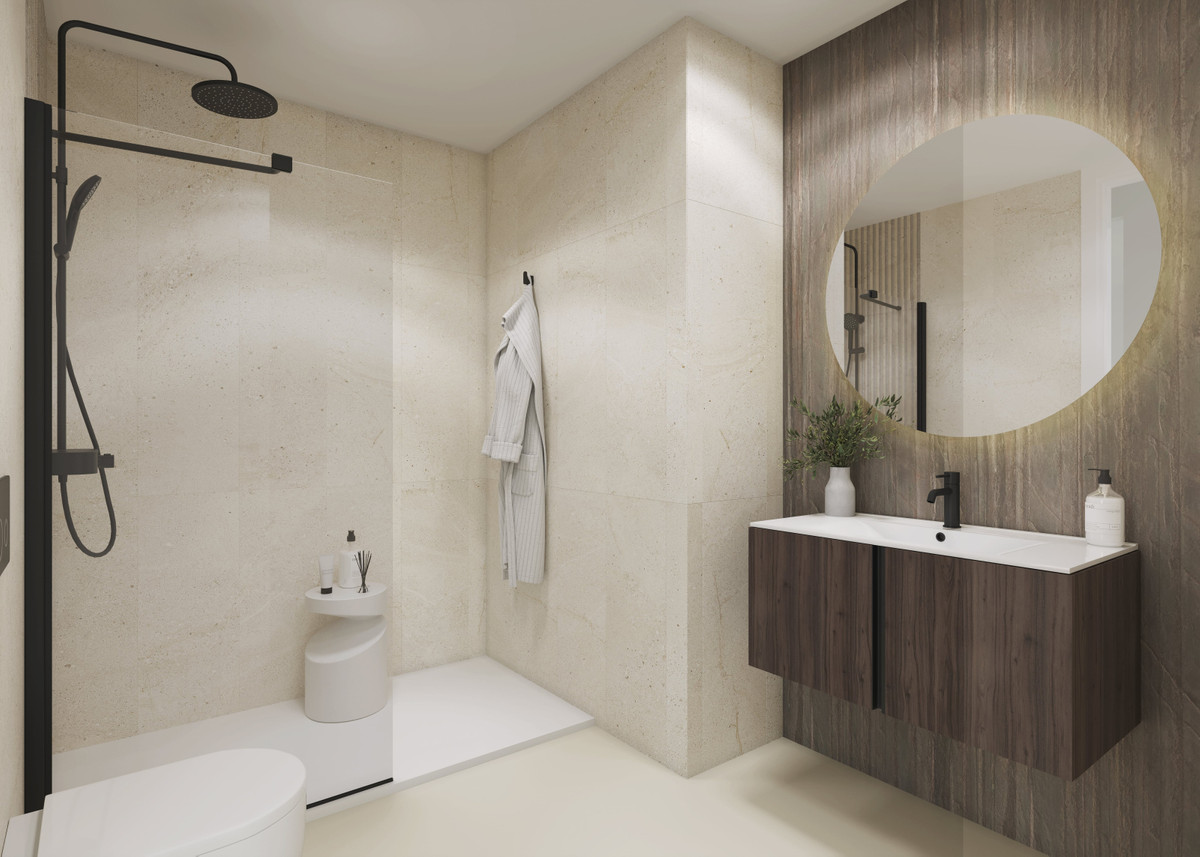 Det er også vigtigt at nævne, at vi vælger super premium finishmaterialer. Alle gulve, fliser og naturstensdetaljer i badeværelserne samt badeværelsesmøbler, brusere og haner kommer fra Porcelanosa. Vinduerne vil være premium dobbeltglas enheder med et specielt solfilter fra Cortizo!