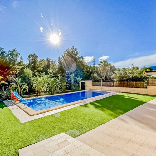 Detached villa of 200m2 built on two floors on a plot of 500 m2. On the main floor, it has a bedroom, bathroom with shower, living-dining room with access to the terrace and the garden, and independent kitchen with laundry room. On the upper floor, there are three bedrooms and a bathroom; the main bedroom has a terrace with sea and mountain views. The property is very bright and sunny, and has a swimming pool, barbecue area and garden. Ideal to enjoy wide and exterior spaces. Located in a quiet area, close to services such as supermarkets and public transport.