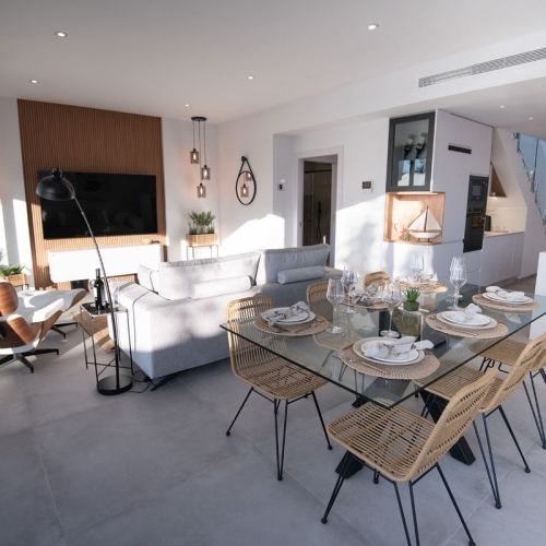 Denne udvikling er en villa i moderne stil med et rent og elegant design, med en indretning, der er orienteret mod det mediterrane lys, der fylder hele husets indre. Åbne dagområder, hvor køkkenet smelter sammen med stuen og skaber et sammenhængende område afgrænset af en central ø, et fantastisk område at nyde morgenmad eller daglige måltider. Stue og spisestue forbindes med verandaen og poolterrassen og skaber et enkelt rum. Denne villa har tre soveværelser, to badeværelser og et charmerende udendørs toilet, der betjener poolområdet. Hovedsoveværelset er meget lyst, med eget badeværelse, klædeskab og direkte adgang til husets hovedterrasse, hvor poolen er. Den fantastiske solterrasse på toppen af huset med en stor terrasse er det perfekte sted at nyde solen.