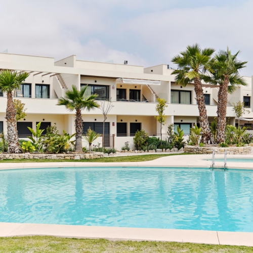 Moderne bygning med lejligheder med 2 og 3 soveværelser, sidelig havudsigt, store terrasser i glas og stål samt fælles tagpool.