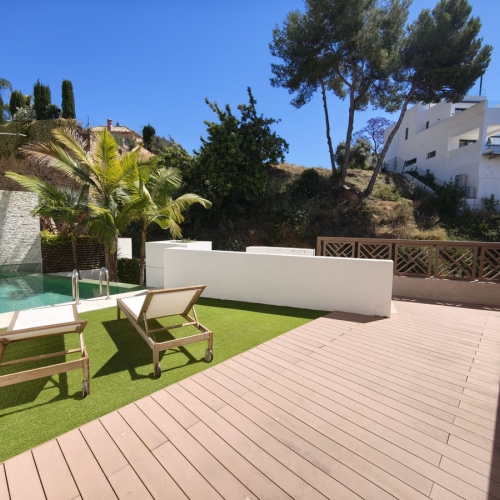 Ground Floor: Upon entering, you are greeted by a spacious living room with large windows that allow in abundant natural light. The kitchen is open and modern, equipped with high-end appliances. On this floor there is also a bedroom with a built-in wardrobe and a full bathroom. From the living room, there is access to a private terrace with unbeatable views of the pool and the mountains, ideal for enjoying relaxing moments outdoors. In addition, it has a large patio next to the main entrance.