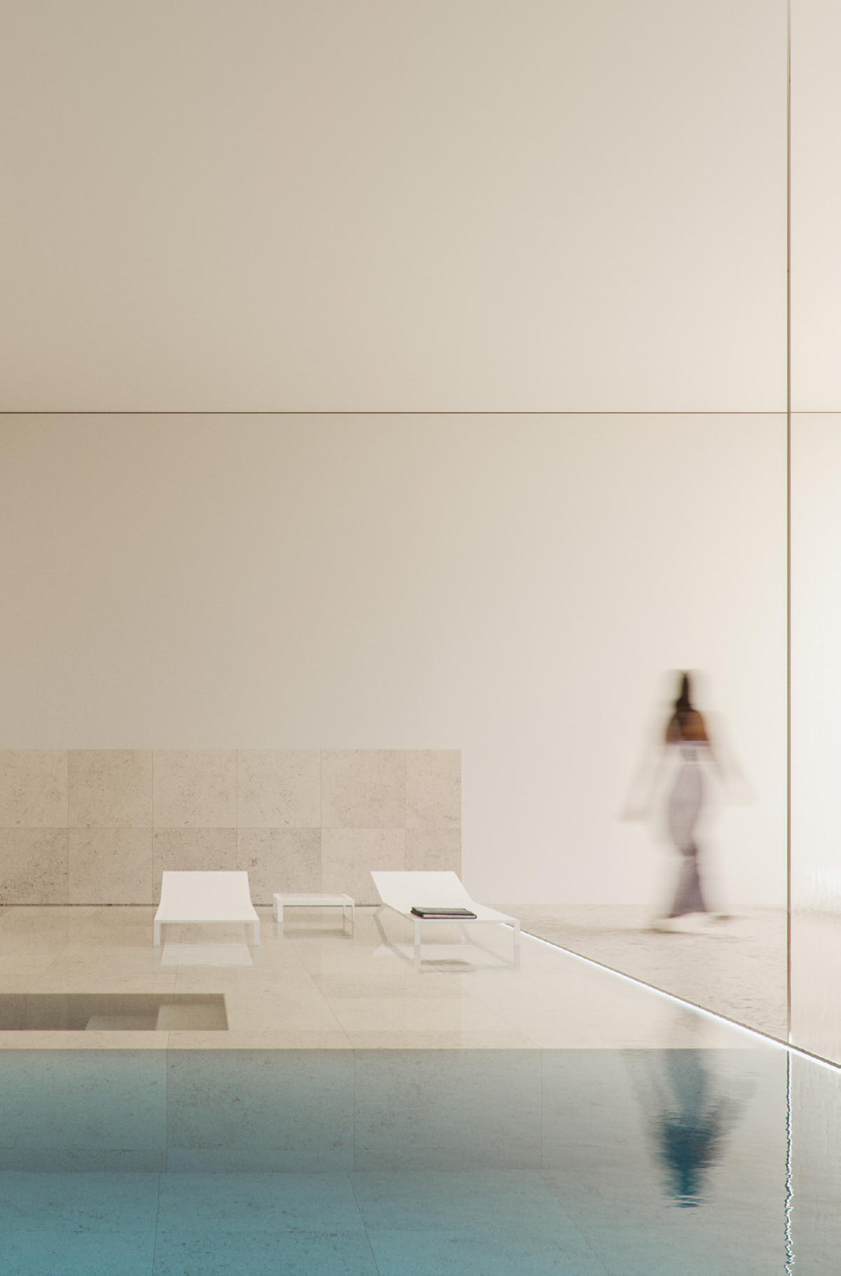 En 12 x 3 meter udendørs pool og spejlvandsspejl skaber en rolig og lysfyldt atmosfære.
