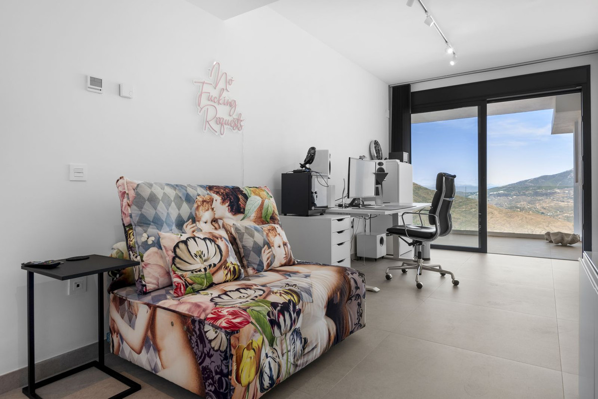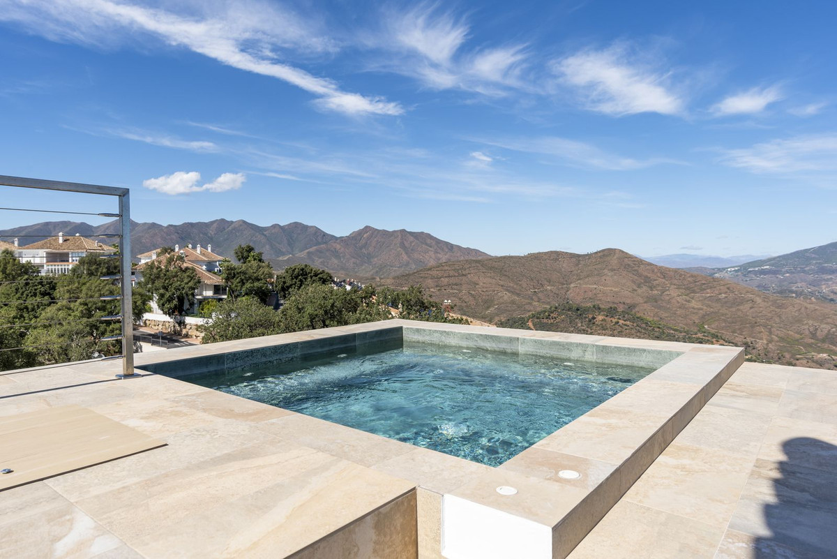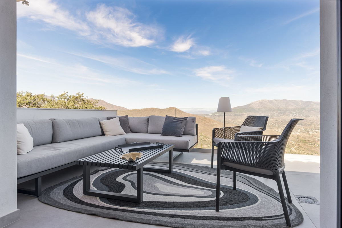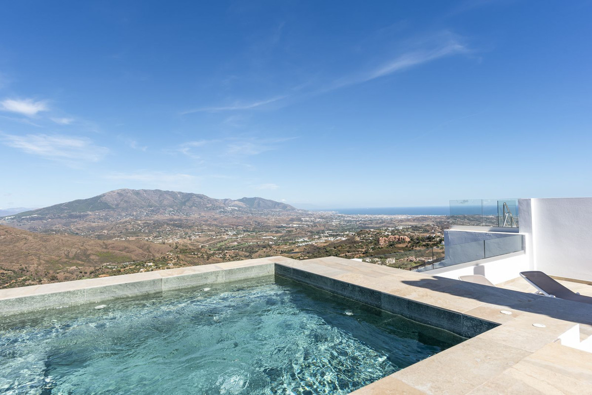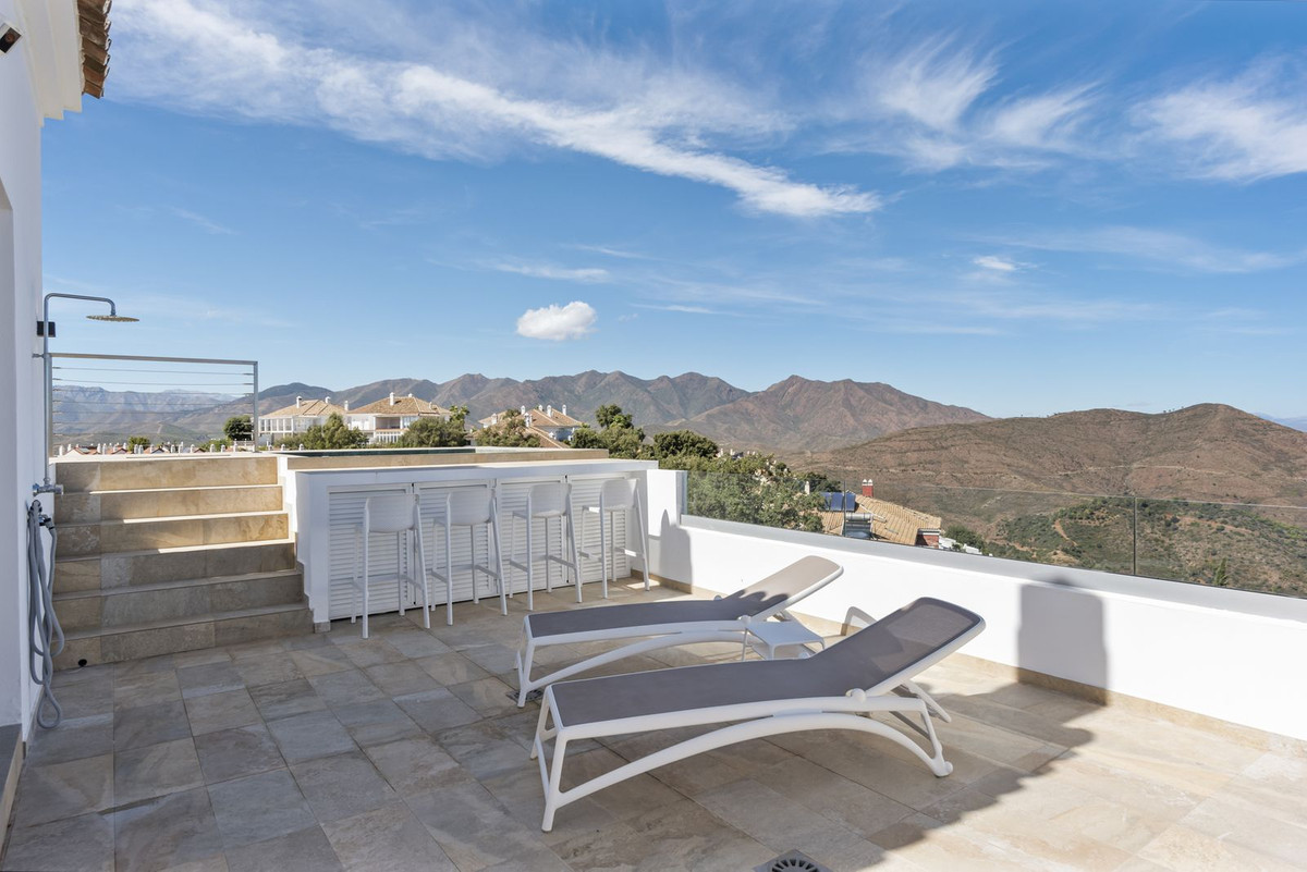 The top level is your personal outdoor oasis. This sun-soaked terrace is designed for relaxation, featuring a jacuzzi, plunge pool, and a bar area. Whether hosting guests or enjoying a quiet evening, the spectacular views of the UNESCO-protected Sierra Alpujata and the charming village of Mijas, sunrise over the Mediterranean in the west, and sunset over the national park ‘Sierra de las Nievas to the east. There's also a guest toilet and a pedestrian bridge providing quick and convenient street access and parking from this level.