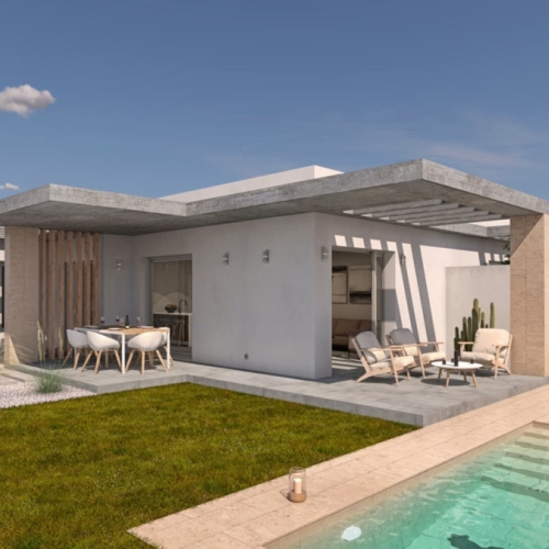 Vi introducerer en stor 'Ventura' sammenbygget villa og 8 semi-detached villaer, hver designet til at give den ultimative open-plan booplevelse. Disse villaer har dobbelte glas skydedøre, der åbner op til en rummelig terrasse med et privat swimmingpool, ekstra terrasseplads og parkeringsområde.