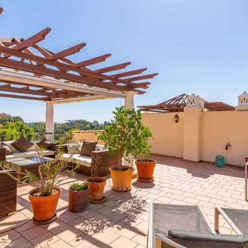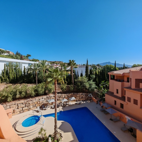 This apartment is located above San Pedro de Alcántara with fantastic sea views. The apartment has an open kitchen, living-dining room, 2 bedrooms, 2 bathrooms and a room that is currently used as an office. The urbanization has a pool area. From La Heredia you can reach the center of San Pedro or the beach in just a few minutes.