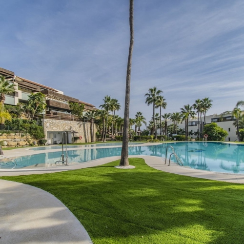 Beautiful one bedroom apartment in Alhambra del Mar on the Golden Mile of Marbella only 100m from the beach promenade and close to all amenities. The apartment consists of a spacious living-dining space with open American kitchen and direct access to a nice terrace with lovely views to the tropical garden of the complex. Furthermore there is a good size bedroom with bathroom and a small dressing area en suite. It is surrounded by the lush gardens and fountains of the Alhambra del Mar urbanization which evoke a permanent feeling of holidays and breathing space. With all amenities at hand and just a few metres from the beach, Capuccino and at walking distance to Marbella centre, the apartment offers an excellent location and a rare opportunity to live by the sea. Includes a good sized storage in the basement.