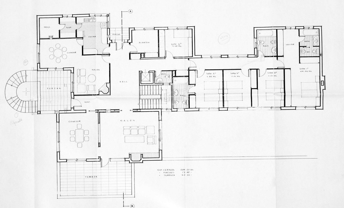 The house stands on a terraced plot of 4164 m2, in which there are several terraces, tennis court with changing rooms, swimming pool, orchard, gardens, wild area of virgin Mediterranean vegetation, barbecue and 'paellero', garage and a well for irrigation water.