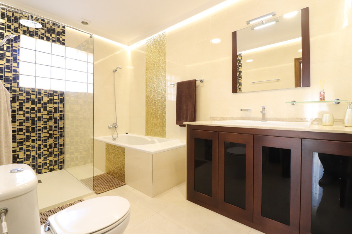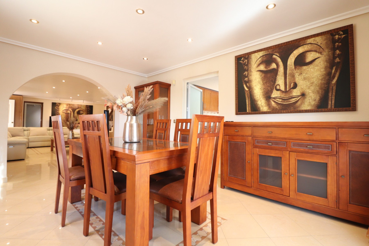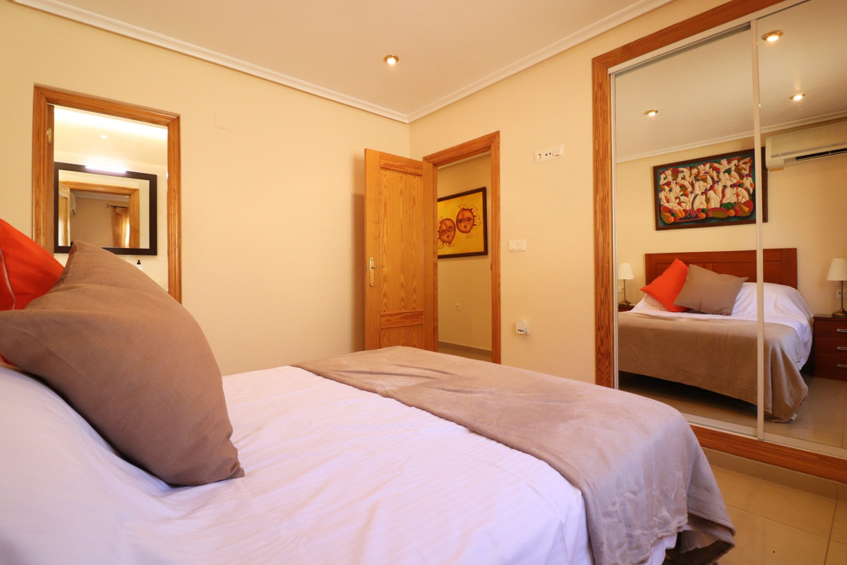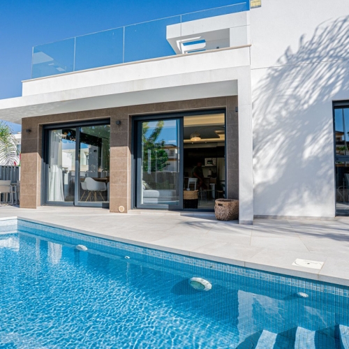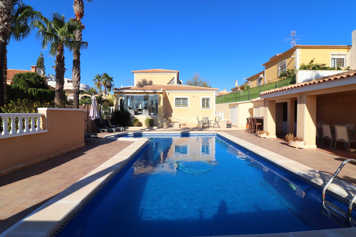 This Spectacular, West Facing, Four Bedroom Detached Villa + Separate Two Bedroom Annex in San Fulgencio is located on the urb of La Escuera, La Marina, within a 15-minute walk of amenities and facilities. The main villa offers a luxurious layout with four bedrooms and four shower rooms, each bedroom benefiting from an en suite bathroom. One bedroom includes a spacious walk-in wardrobe, while the other three have fitted wardrobes. The property boasts a family-sized living room with a charming bodega-style display, as well as a separate kitchen with a feature island and an adjoining utility room. Air conditioning and window grills are fitted throughout, and the lounge opens onto a covered terrace with sliding glass curtains that overlook the private 8x4 swimming pool. The master bedroom also enjoys a solarium with lovely views of the urbanization. The annex is thoughtfully designed with two bedrooms, two shower rooms, an open-plan fully fitted kitchen, and a cozy lounge/dining room that leads to a covered terrace, ideal for outdoor dining. Outside, the property features a spacious private garden, complete with an outdoor bar, BBQ area, and a storage cupboard. Off-road parking is also available, ensuring convenience and accessibility. This villa combines elegance, comfort, and outdoor living, making it a wonderful option for a family home or vacation retreat.