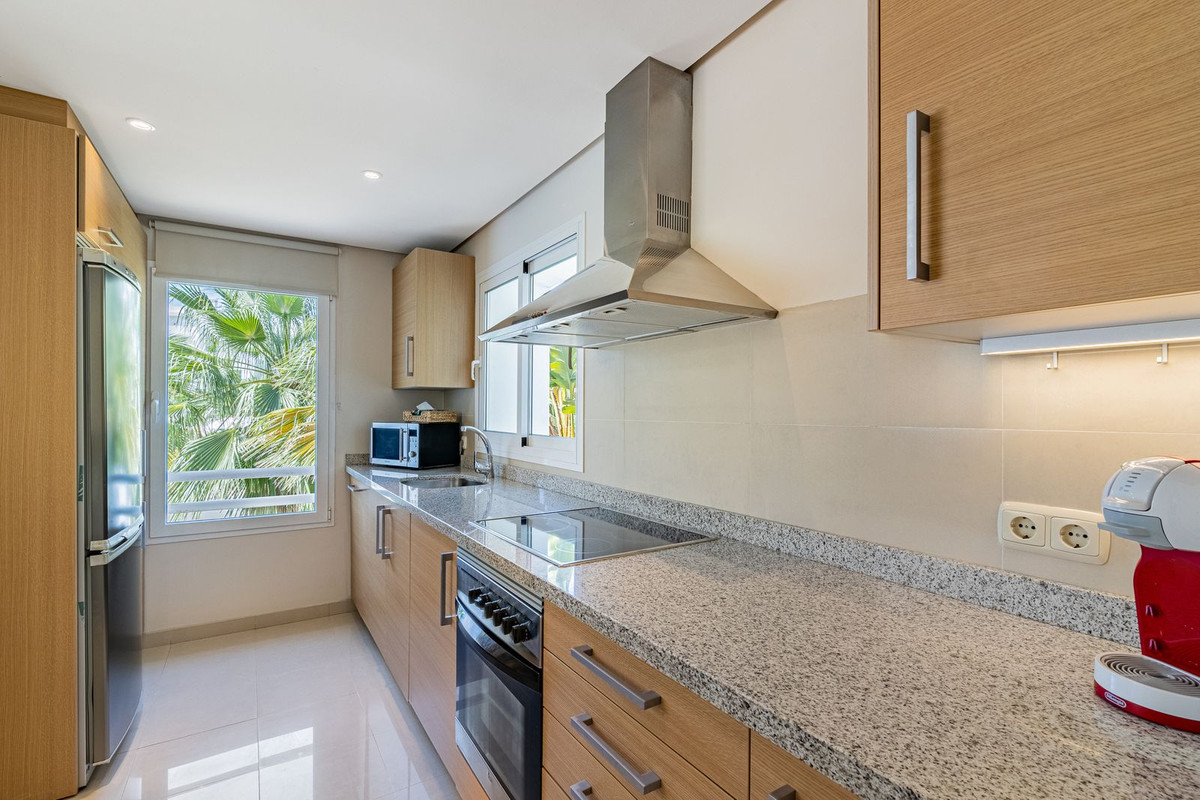 Designed to a high standard of quality and elegance, this flat features ample built-in wardrobes and an efficient hot/cold air conditioning system to ensure year-round comfort. The clever layout includes two bedrooms, one with en-suite bathroom, and an additional guest toilet. The heart of the property is undoubtedly its spacious living room, flooded with natural light thanks to its large glass doors. The kitchen, fully equipped with high quality appliances, offers an ideal environment for the home chef.