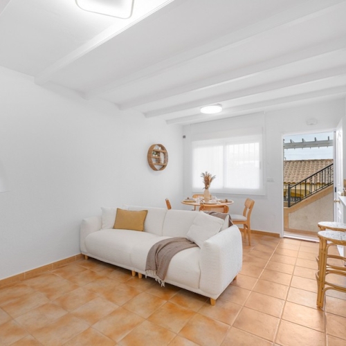 Are you looking for a bright, spacious, and well-located home? This 114 m² semi-detached duplex in Lomas del Golf, Villamartín, is the perfect choice. With a south-facing orientation for natural light all day, this property stands out for its functional design and numerous outdoor spaces.. . Main Features:. . •Area: 114 m².. •Bedrooms: 3, including one on the ground floor, ideal for family or guests.. •Bathrooms: 2, comfortable and well-distributed.. •Spacious living-dining room with direct access to the terrace.. •Open-plan kitchen fully equipped.. •Terrace on the upper floor and a solarium with a pergola, perfect for enjoying sea views.. •Private backyard with ample space to install a pool.. •Air conditioning throughout for optimal comfort.. . Lomas del Golf Community:. . The community offers several communal pools and is close to all amenities. Ideal for both permanent residence and vacations.. . This house for sale in Villamartín comes fully furnished. Move-in ready!.