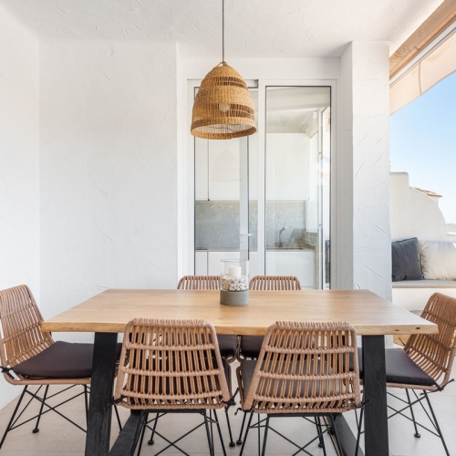 Located just few min away walking distance from Los Naranjos Golf Club this community offers great security 24/7 , easily and fast reachable main amenities like supermarkets, schools . Urbanization has 2 communal pools , garages and well maintained gardens. Perfect for the lovers of evening sun while gazing at the playing golfers. This property offers two terraces. One is North facing and very private and the main one that you can enter from the living room is West facing . The second terrace has SEA VIEWS . Both two bedrooms in the apartment have en suite bathrooms + a guest toilet. There is a possibility to make a third bedroom if needed.