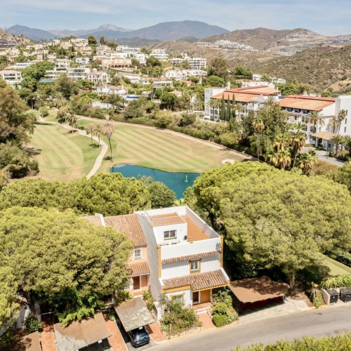Large family 4-level corner unit townhouse located in a front line golf gated complex in La Quinta, Benahavís. It comprises, on the main level: open-plan fully fitted and equipped kitchen; living and dining area with access to a terrace offering lovely views to La Quinta golf; guest bedroom; guest toilet.