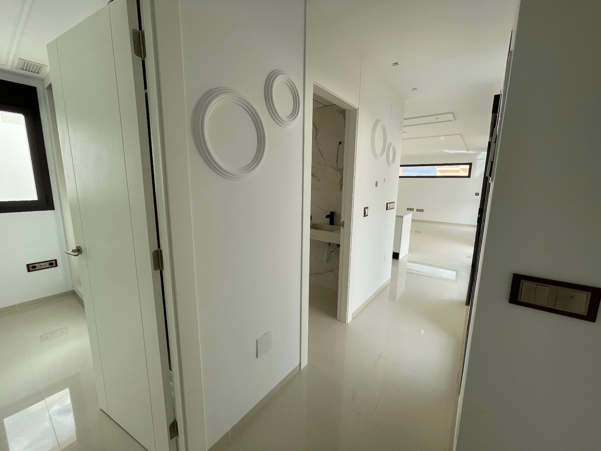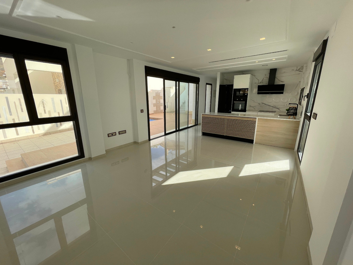 This beautiful detached 3-bedroom, 3-bathroom home is located in Benijófar, steps away from all essential services and the new Benisol shopping center. The spacious interior includes a large living room and an open-plan, fully-equipped kitchen with an oven, microwave, dishwasher, range hood, and refrigerator.The property offers per-installation for air conditioning and built-in wardrobes in every bedroom. On the ground floor, you'll find two of the three bedrooms, including one with an en-suite bathroom, as well as an additional shared bathroom. The third bedroom, also en-suite, is located on the first floor and is accessible by an external staircase, providing an independent entrance. This upstairs suite features a dual-sink bathroom and opens onto a vast 70 m² solarium with stunning mountain views.Outside, enjoy the private swimming pool, parking on the property, and a storage area cleverly designed under the stairs. This home is set in one of Benijófar's most popular areas, blending convenience, privacy, and style.
