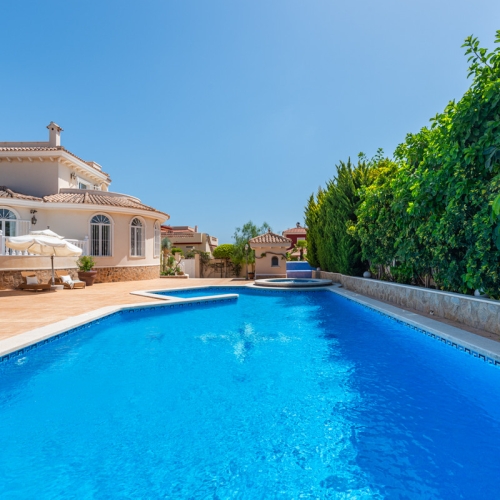 A large saltwater pool leads you to an outdoor kitchen (with refrigerator/freezer and dishwasher) and bar, as well as spacious areas for dining furniture, a lounge section, and sun loungers. The house also opens up with a spacious and modern kitchen, a TV room, a large bathroom with a shower, and four bedrooms, including a master bedroom with a walk-in closet and an ensuite bathroom with a shower. There is underfloor heating in the ensuite bathroom and the kitchen.