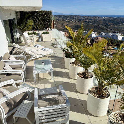 Duplex Penthouse for sale in , Mijas Costa with 2 bedrooms, 2 bathrooms and with orientation south, with communal swimming pool and private garage (1 parking spaces). Regarding property dimensions, it has 110 m² built, 179 m² plot, 94 m² interior and 60 m² terrace. Has the following facilities amenities near, air conditioning, central heating, fully fitted kitchen, utility room, jacuzzi, sauna, satellite tv, storage room, solarium, double glazing, video entrance, brand new, security service 24h, private terrace, kitchen equipped, living room, sea view, mountain view, golf view, indoor pool, security shutters, laundry room, covered terrace, 24h service, electric blinds, gated community, lift, panoramic view, underfloor heating (bathrooms), close to children playground, close to sea / beach, close to golf, uncovered terrace, open plan kitchen, balcony, handicap accessible, close to town, surveillance cameras and inside golf resort.