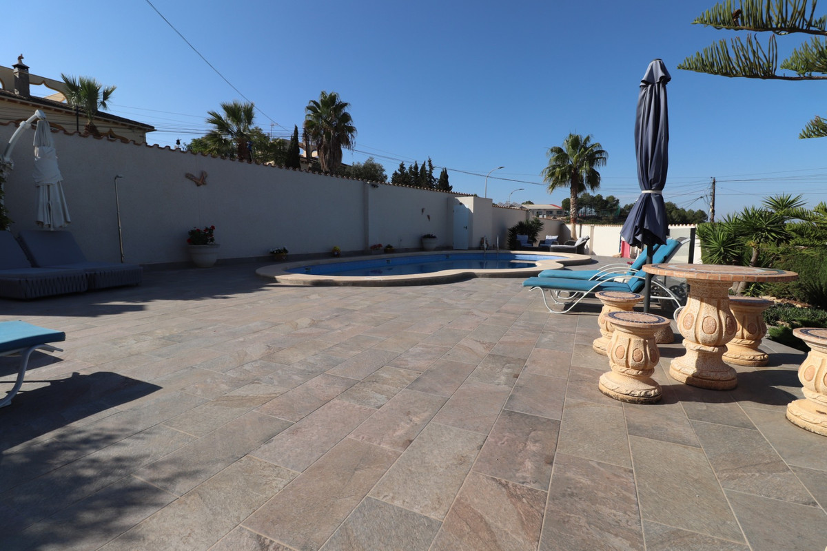 This Remarkable, West Facing, Corner, Five Bedroom Detached Villa in Lomas de La Juliana is located in a prominent position on the Costa Blanca South, under the area of Almoradi but closer to and conveniently situated between Algorfa village and the prestigious La Finca Golf, Hotel & Spa Resort. With a tennis club just at the top of the road and main brand amenities only a few minutes' drive away, the blue flag beaches of Guardamar del Segura are also just 15 minutes away! This incredible property spans an impressive 375m² build size on a stunning 1,149m² plot, offering panoramic views of the countryside, citrus groves, mountains, and sunsets. The main villa has been fully updated and modernized, retaining its character and charm, and includes three bedrooms and three bathrooms. Upon entering, the hallway leads to an open-plan, fully fitted kitchen with a breakfast bar, a spacious family-sized living room with a cozy log-burning fireplace, and direct access to the large front covered terrace, perfect for appreciating the breathtaking views. There's also a dining room with rear garden access, a shower room, and two bedrooms on the ground floor, one with an en-suite bath and shower. The upper-level master bedroom features a walk-through wardrobe, dressing table, and an en-suite shower room. The separate annex, located in the under-build, provides two additional bedrooms and a bathroom, accessed via the double garage or independently from the rear. This space includes a separate kitchen and dining area, a large bedroom with a living area and office, plus an en-suite shower. The garage is currently used as a games room with a pool table, ping pong, utility space, and an adjoining storeroom. Outside, the gravelled and tiled garden features an updated private swimming pool, a BBQ area, a small putting green, and ample space for outdoor dining and entertaining. Additional highlights include a carport, off-road parking, oil central heating, air conditioning throughout, ceiling fans, fitted wardrobes in the main villa, and dual entrances from different roads. This is an extraordinary opportunity to own a substantial and versatile property with fantastic views in an enviable location!