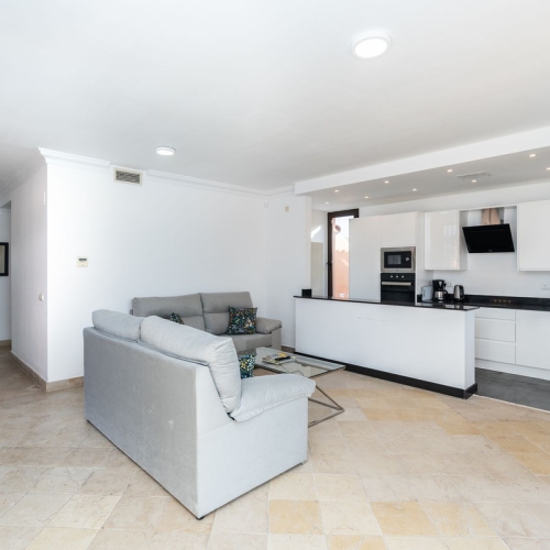 The apartment has a spacious separate entrance which leads comfortably into a spacious living room, separate kitchen and guest toilet. From the lounge there is access to a large south facing terrace, ideal for sunbathing, with spectacular sea views and natural light throughout the day. The spacious rooms will make you feel on top of the world. There is also a private heated swimming pool for Mediterranean style swimming. The terrace leads to the first floor, where there is a spacious 186m² solarium with uninterrupted views of the mountains, Gibraltar and the port of Estepona, all bathed in the blue of the Mediterranean.