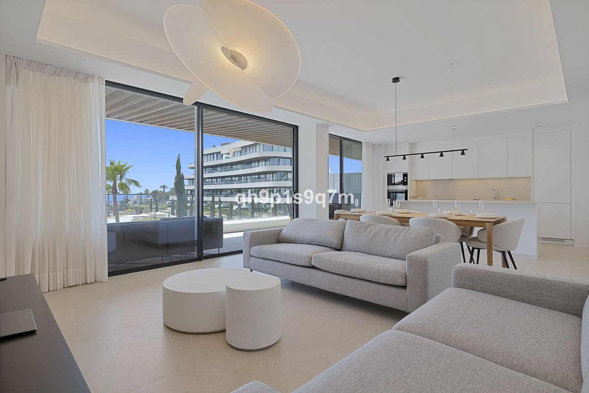 The apartment features three spacious bedrooms, including a master suite with an en suite bathroom and a walk-in wardrobe for added comfort and practicality. Two of the bedrooms open onto a private terrace, providing additional outdoor space to relax and enjoy the fresh sea air. The remaining bedroom is thoughtfully designed to accommodate guests or family members, with easy access to a second full bathroom and an additional guest toilet.