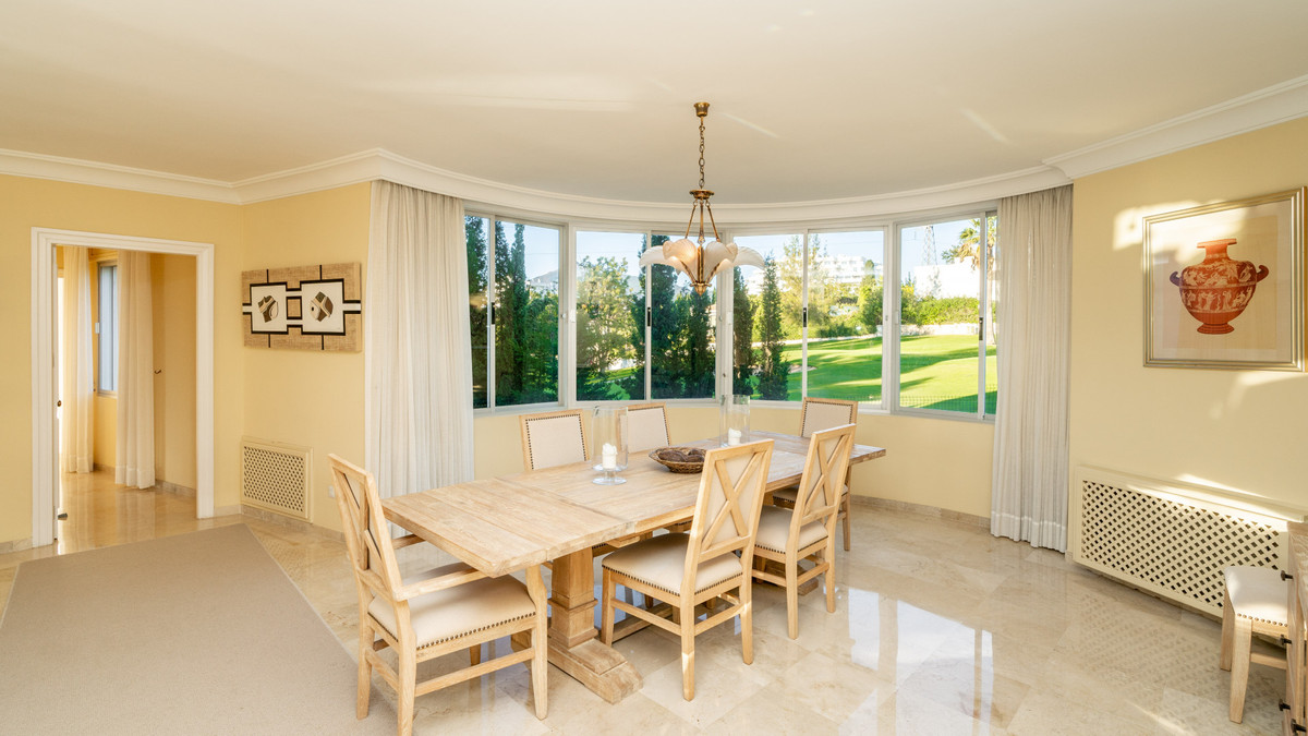 The apartment boasts three generously sized bedrooms and three bathrooms, ideal for both family living and entertaining. A newly renovated kitchen combines sleek design with outstanding functionality, while the expansive living area includes a charming fireplace and stylish marble floors. The southwest-facing orientation floods the space with natural light and offers beautiful sunsets from the large, covered terrace. Beyond the terrace are views of the Guadalmina River with its ever changing scenery.
