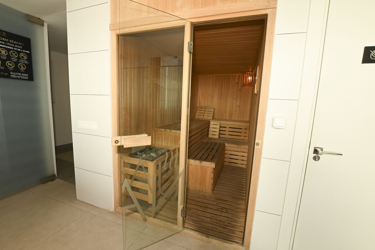 Heated swimming pool and a modern gym with panoramic sea views on the 26th floor of the block.