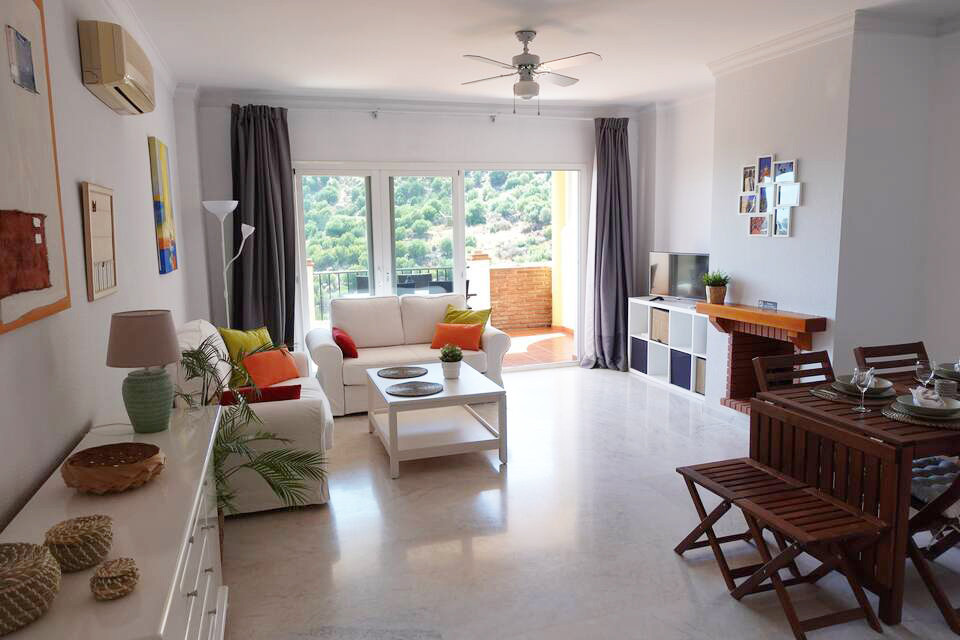 Apartment for sale in , Mijas Costa with 2 bedrooms, 2 bathrooms and with orientation south/west, with communal swimming pool and communal garden. Regarding property dimensions, it has 87 m² built and 22 m² terrace. Has the following facilities amenities near, air conditioning, central heating, fully furnished, fully fitted kitchen, satellite tv, guest room, guest toilet, private terrace, kitchen equipped, living room, sea view, mountain view, internet - wi-fi, covered terrace, gated community, close to golf and excellent condition.