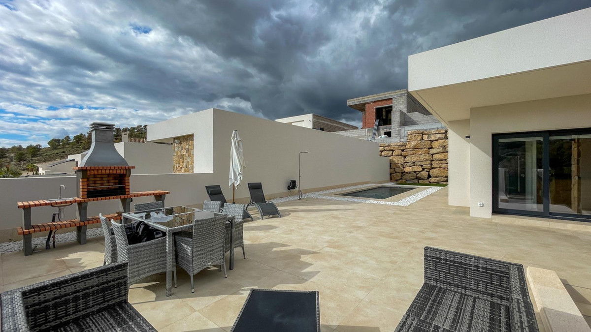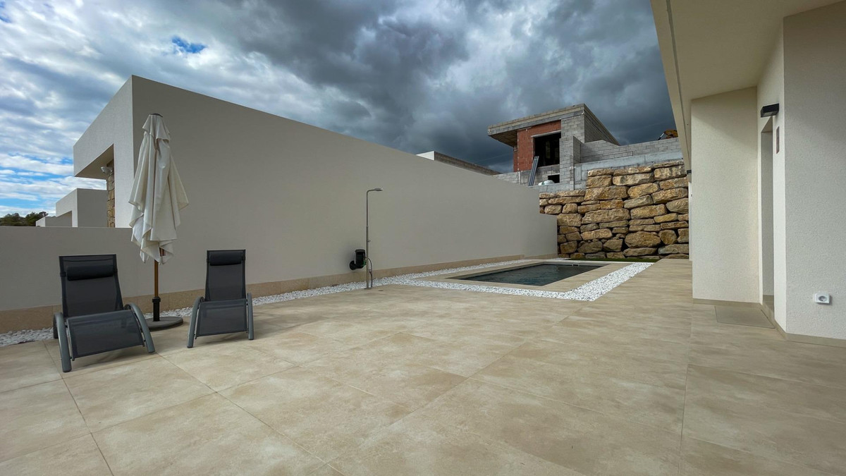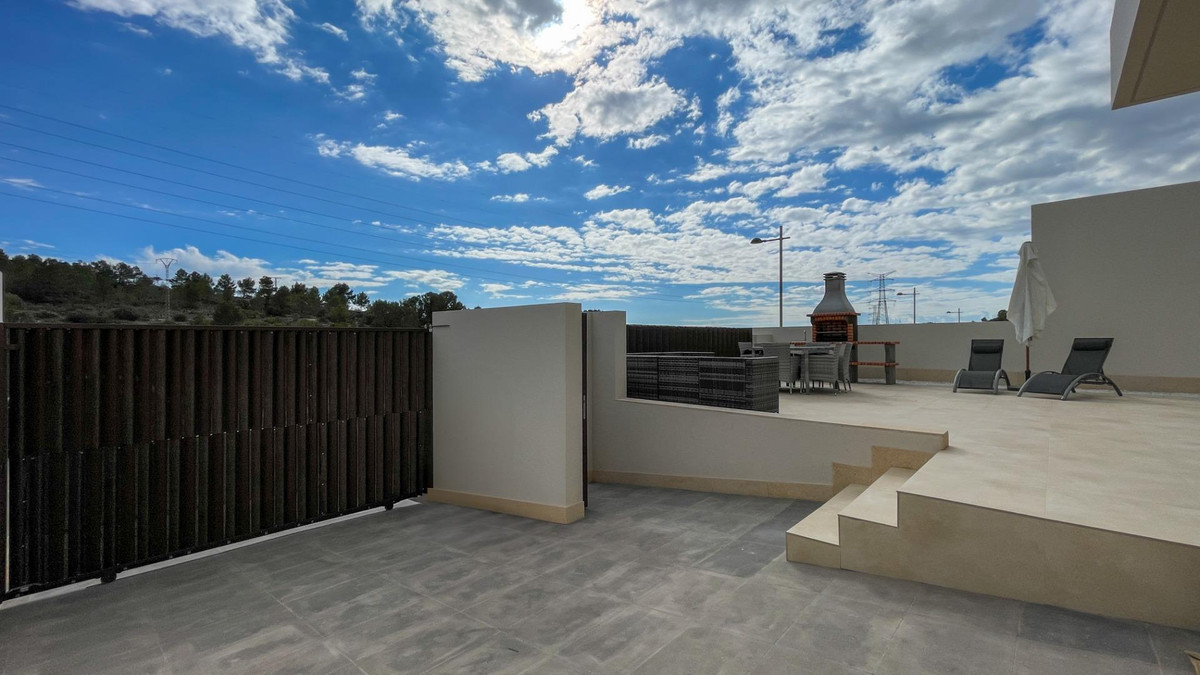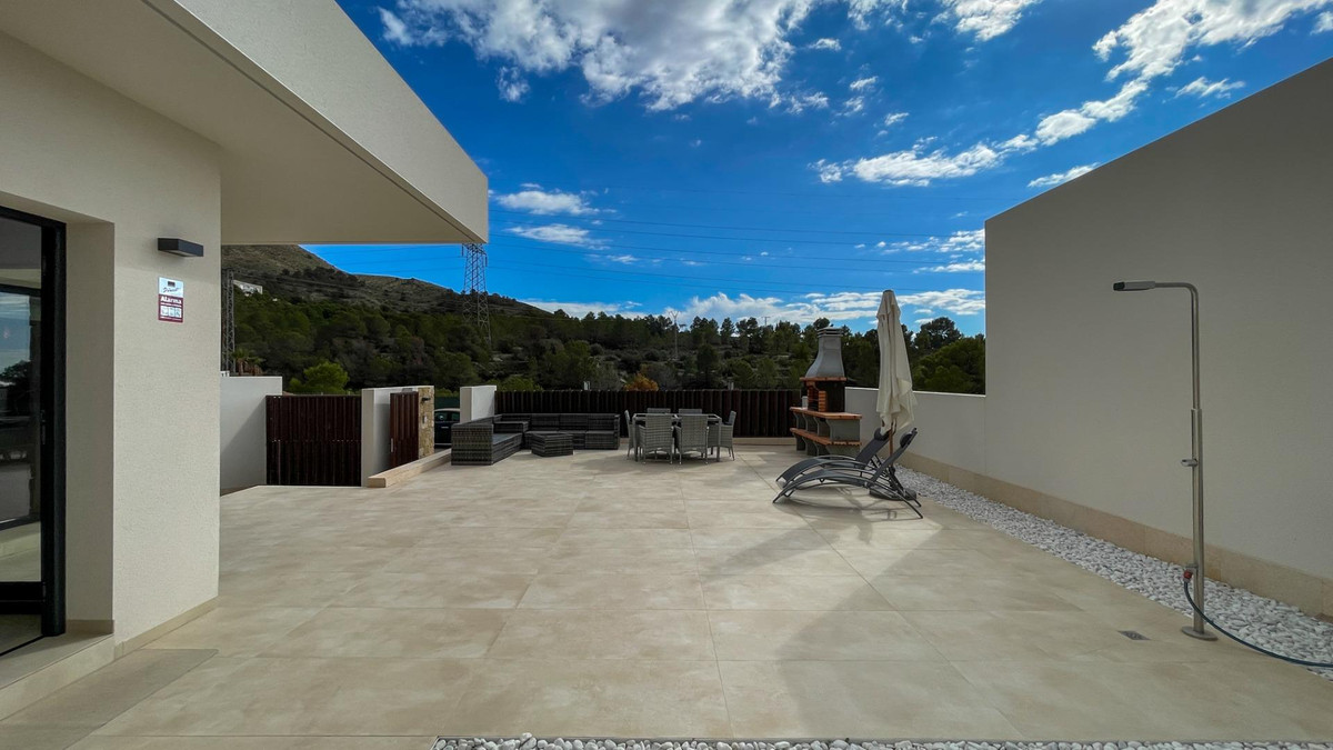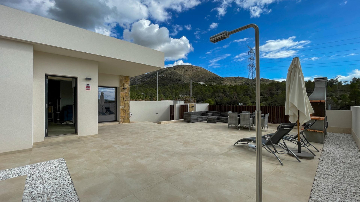 Discover this stunning villa located in the coveted sector 13 of Finestrat, just 4000 meters from the beach. With an ideal total built area designed for enjoying comfort and modern style, this new property features three spacious double bedrooms and two fully equipped bathrooms. The kitchen is made for food lovers and offers everything needed to delight in cooking.The villa faces south, allowing natural light to flood all its spaces thanks to elegant porcelain stoneware flooring. This home is not only bright but also functional; it includes PMR adapted access, central air conditioning (cool/heat), and alarm installation for additional security.Outside you will find your own private garden adorned with lush trees as well as a pool where you can relax on sunny days under a cozy pergola. Additionally, there's an exclusive patio perfect for family or social gatherings with friends.Additional amenities include strategically designed fitted wardrobes maximizing storage without sacrificing usable space; independent laundry room; armored door ensuring maximum privacy; video intercom providing greater control over accesses;personalized pergolas within the outdoor area protected by automatic doors facilitating quick entry/exit from included parking - all complemented by automatic irrigation ensuring easy maintenance while enjoying every corner both indoors and outdoors!Located near various services such as nearby shopping centers (supermarkets), key local hospitals necessary for urgent medical attention plus schools/educational centers right around gated community creating perfectly safe environment young families seeking grow together . Without question this could be your future dream residence! The sea views are simply breathtaking.