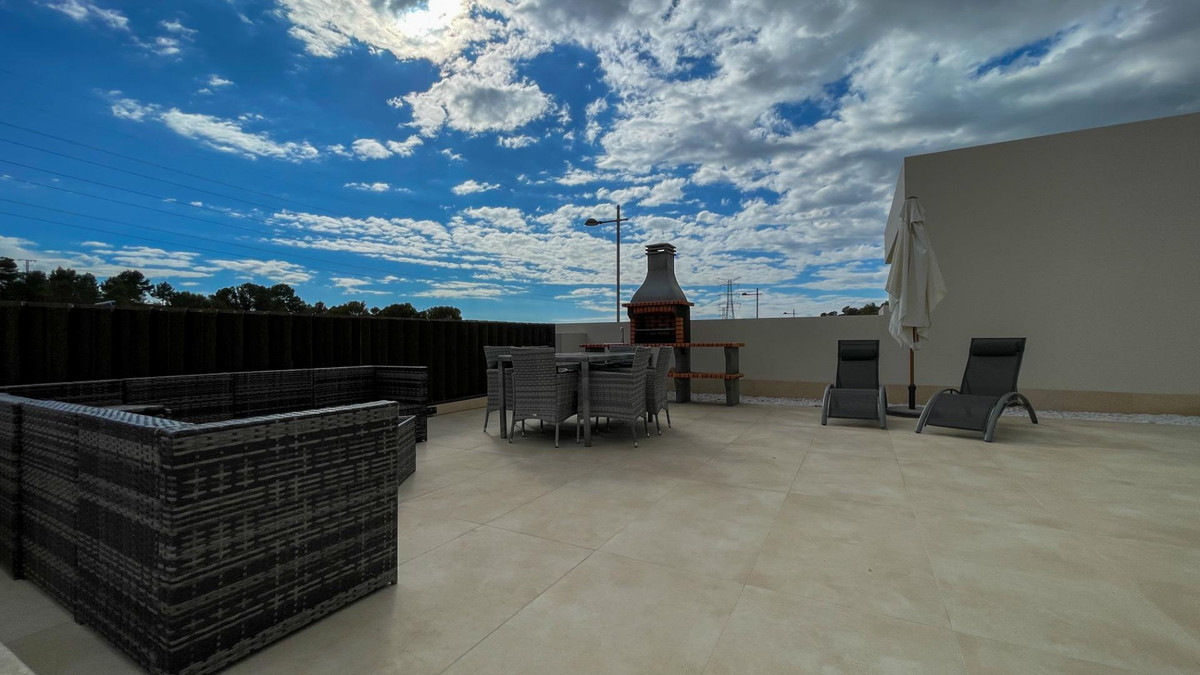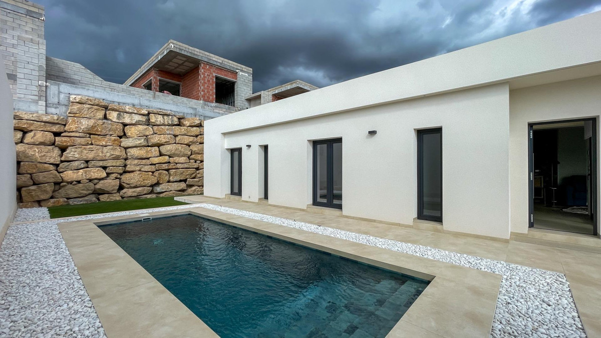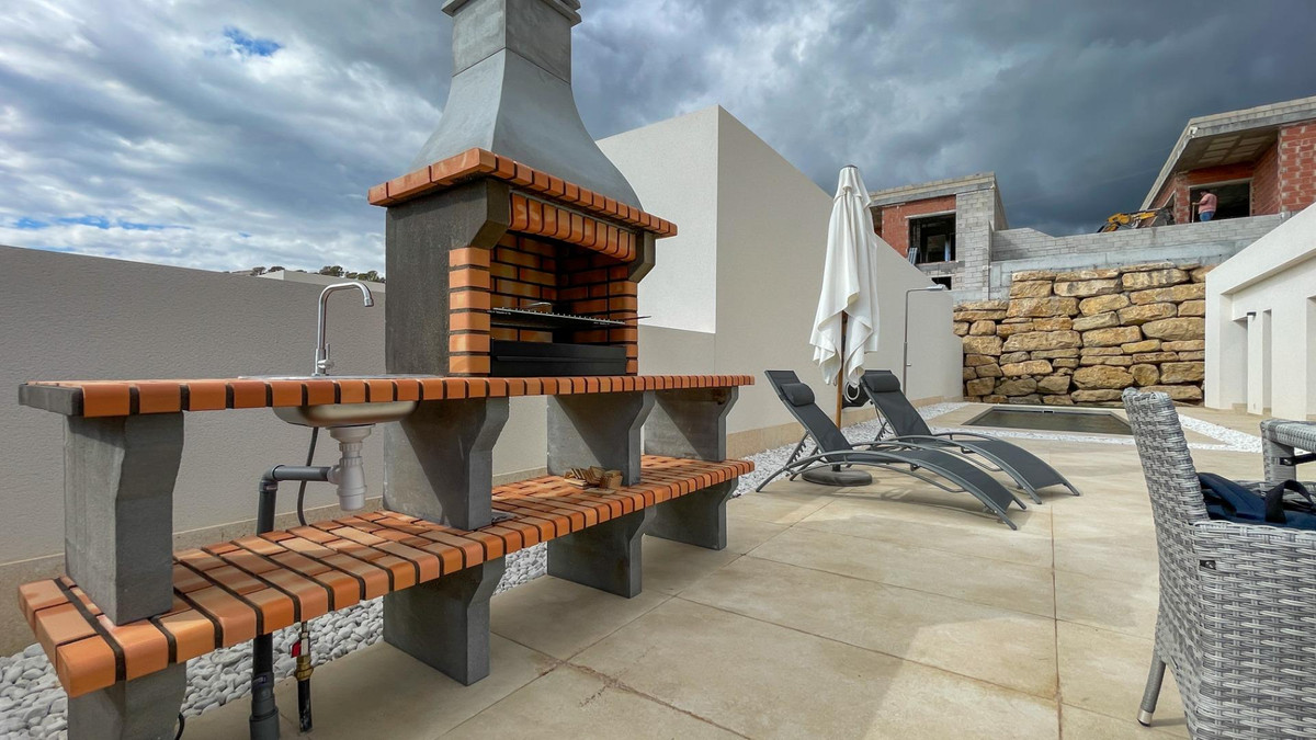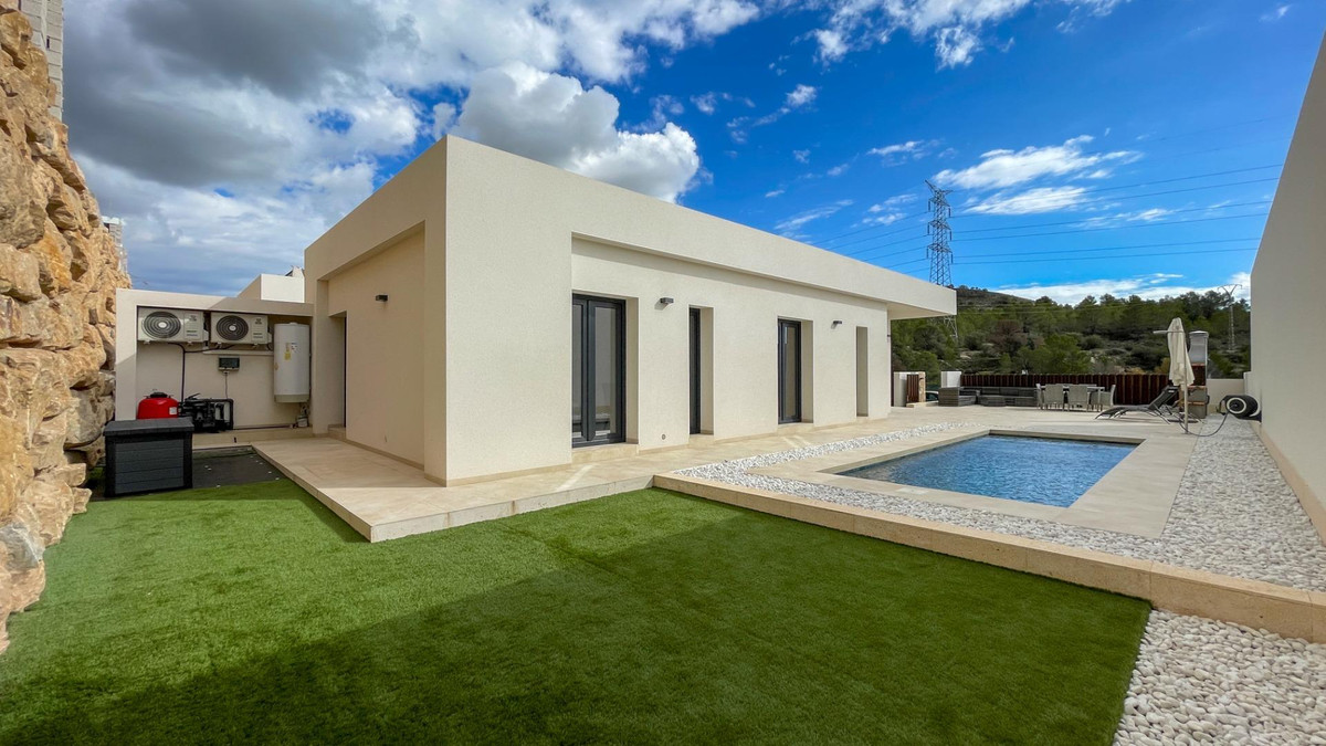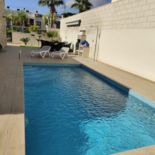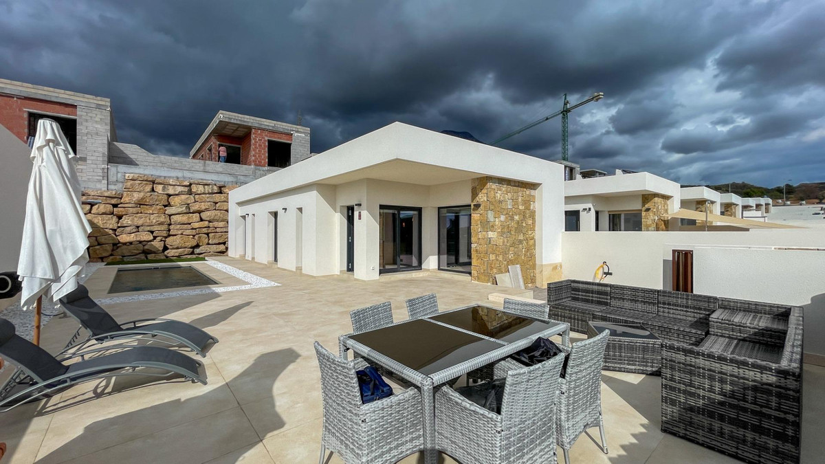 Discover this stunning villa located in the coveted sector 13 of Finestrat, just 4000 meters from the beach. With an ideal total built area designed for enjoying comfort and modern style, this new property features three spacious double bedrooms and two fully equipped bathrooms. The kitchen is made for food lovers and offers everything needed to delight in cooking.The villa faces south, allowing natural light to flood all its spaces thanks to elegant porcelain stoneware flooring. This home is not only bright but also functional; it includes PMR adapted access, central air conditioning (cool/heat), and alarm installation for additional security.Outside you will find your own private garden adorned with lush trees as well as a pool where you can relax on sunny days under a cozy pergola. Additionally, there's an exclusive patio perfect for family or social gatherings with friends.Additional amenities include strategically designed fitted wardrobes maximizing storage without sacrificing usable space; independent laundry room; armored door ensuring maximum privacy; video intercom providing greater control over accesses;personalized pergolas within the outdoor area protected by automatic doors facilitating quick entry/exit from included parking - all complemented by automatic irrigation ensuring easy maintenance while enjoying every corner both indoors and outdoors!Located near various services such as nearby shopping centers (supermarkets), key local hospitals necessary for urgent medical attention plus schools/educational centers right around gated community creating perfectly safe environment young families seeking grow together . Without question this could be your future dream residence! The sea views are simply breathtaking.