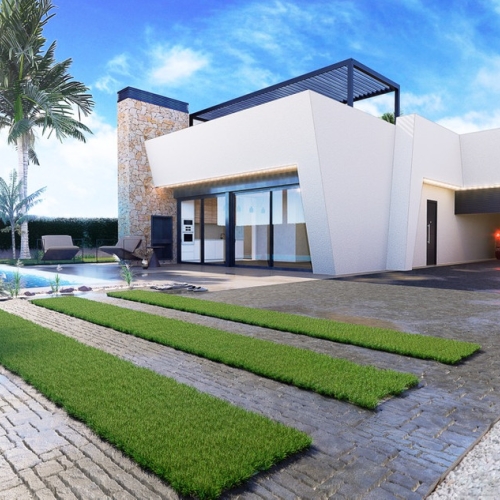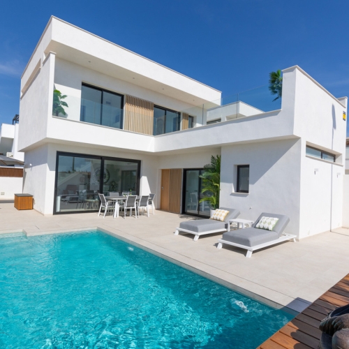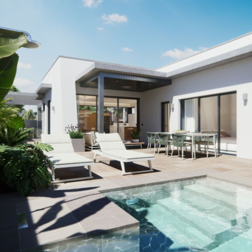 Dette er 3 fritliggende villaer med privat swimmingpool og stort solarium. Ejendommene er designet med terrasseområder omkring, så du kan nyde solen alle årets dage.