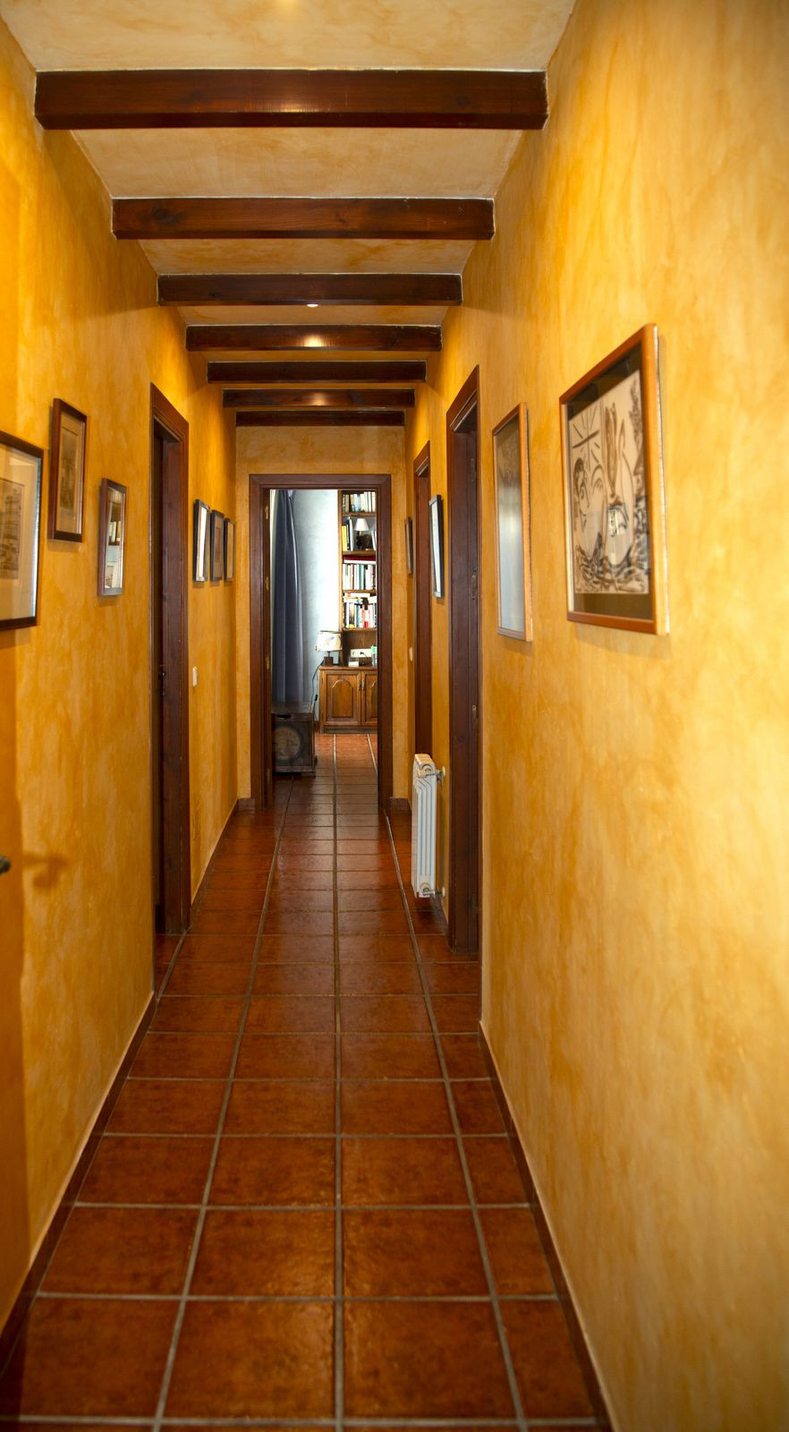 On the upper floor, going up the stairs, with a spectacular coffered wooden ceiling in the form of a tower, there is a large hallway that leads to 2 bedrooms with access to the terrace, a bathroom and a large office/library room that can be used for different purposes depending on the needs.