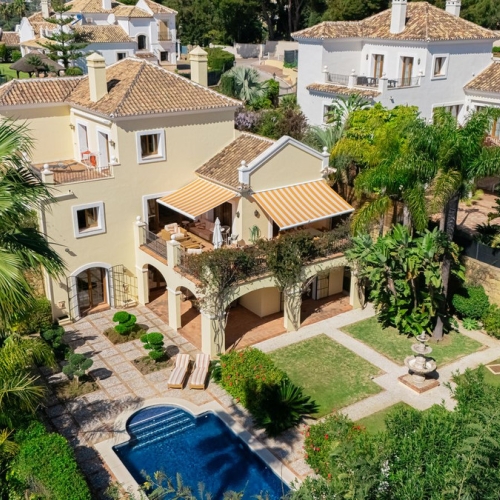 This Andalusian-style villa in El Paraiso Medio offers privacy, stunning views, and proximity to golf courses, and amenities.