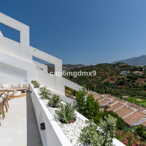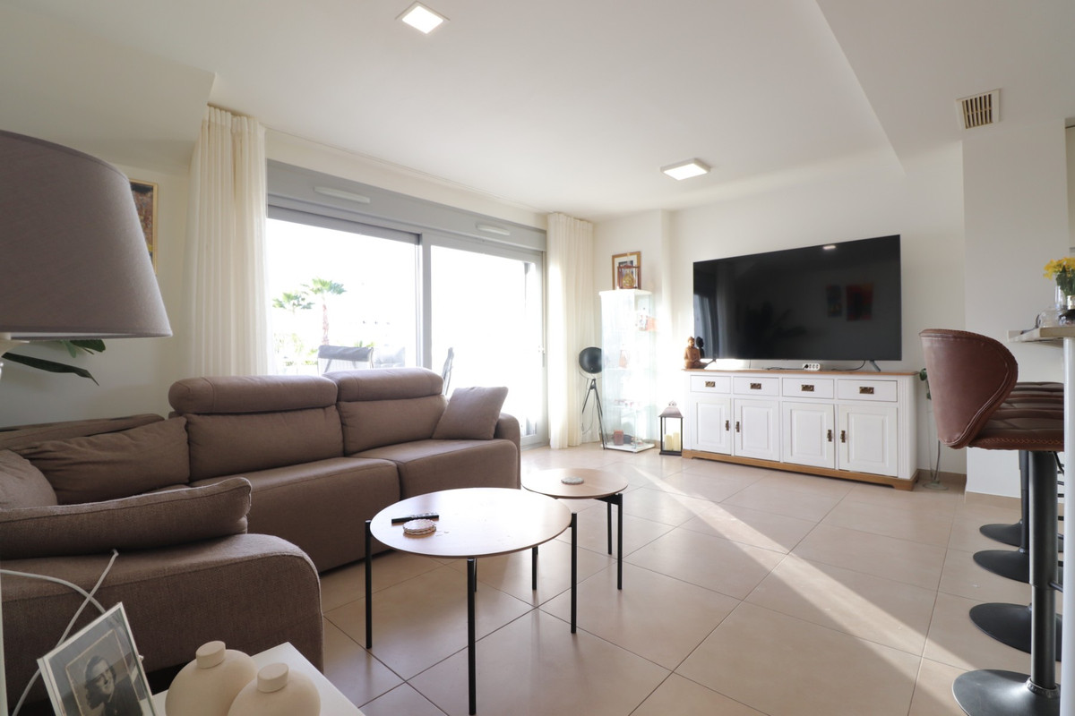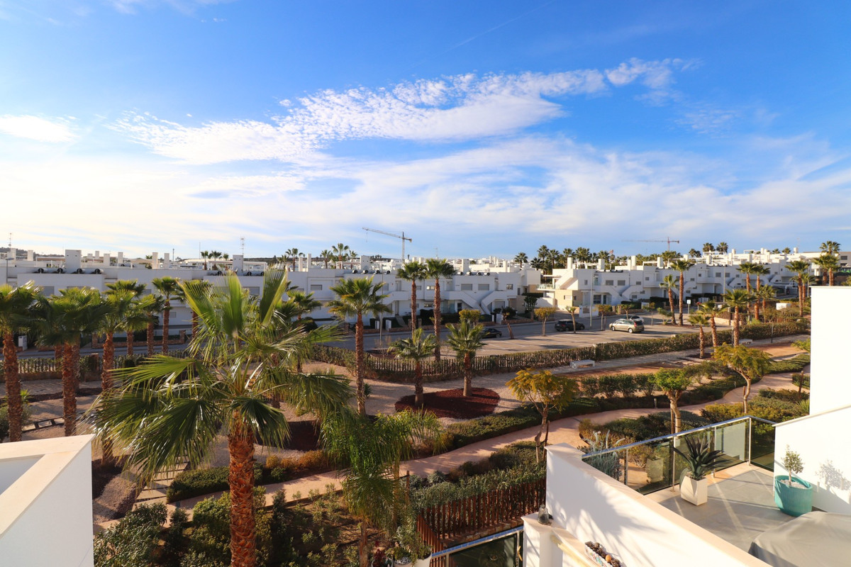 This West Facing, Two Bedroom, Top Floor Modern Apartment in Vista Bella Golf, is located on the borders of the popular golf course, just a five-minute walk to bars, restaurants, and a supermarket. Conveniently situated, it is a five-minute drive to Los Montesinos, ten minutes to Quesada and Benijófar, and approximately twenty minutes to the coast. Built in 2019, this stylish apartment offers a spacious living area with large glazed sliding doors leading out to a generously sized terrace that overlooks the beautifully maintained communal gardens. The open-plan modern fitted kitchen features a substantial breakfast bar, perfect for casual dining and entertaining. The property includes two double bedrooms with fitted wardrobes; the master bedroom benefits from an en suite shower room, while there is also a well-appointed family shower room. External stairs provide access to the fantastic private solarium, which includes storage and a section with sun blinds, allowing for comfortable outdoor dining while taking in the serene views and stunning sunsets. Additional features include ducted air conditioning, four solar panels, and an allocated community parking space. This modern apartment offers the ideal blend of luxury, convenience, and tranquility in the heart of the Costa Blanca South.\n