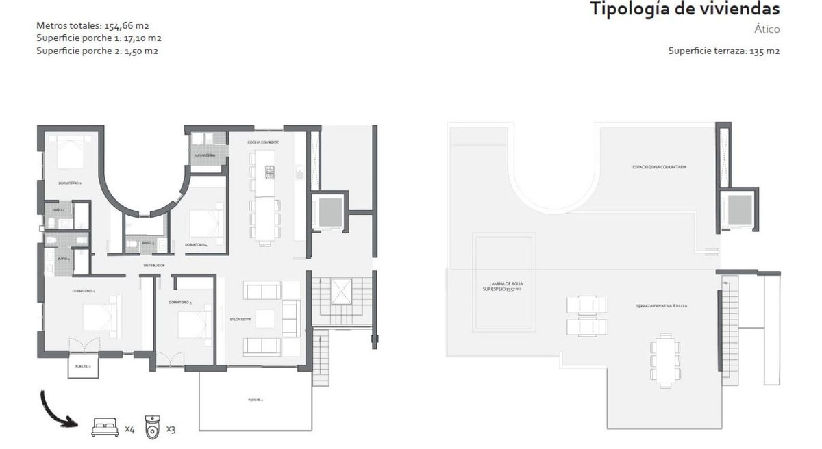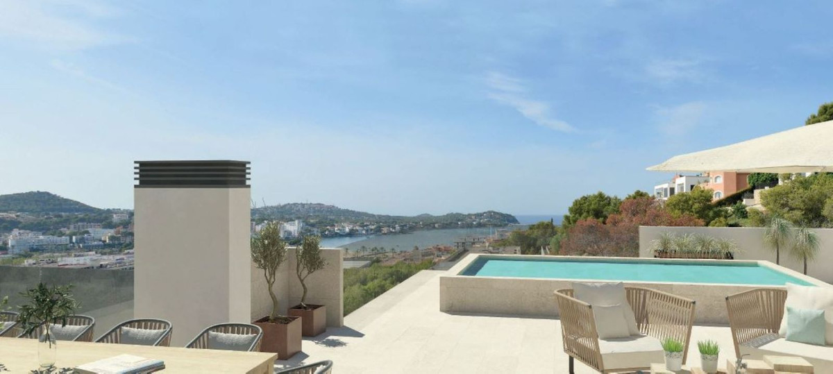 Brand new penthouse of 154.66 m2 with two porches, one of 17.10 m2 and the other of 1.50 m2 in Santa Ponsa with 4 bedrooms and 3 bathrooms, garage and private pool, large terrace of 135 m2, wonderful views, top quality finishes, heating