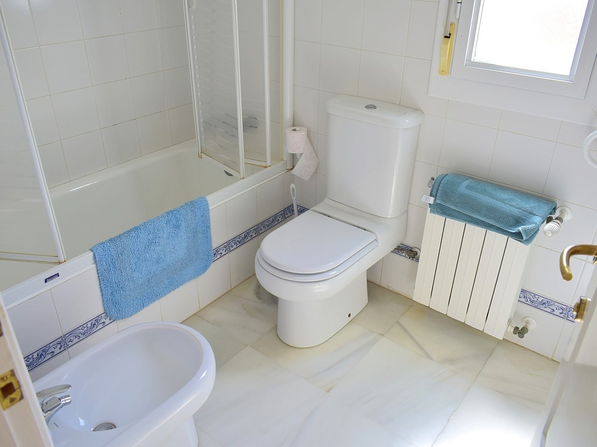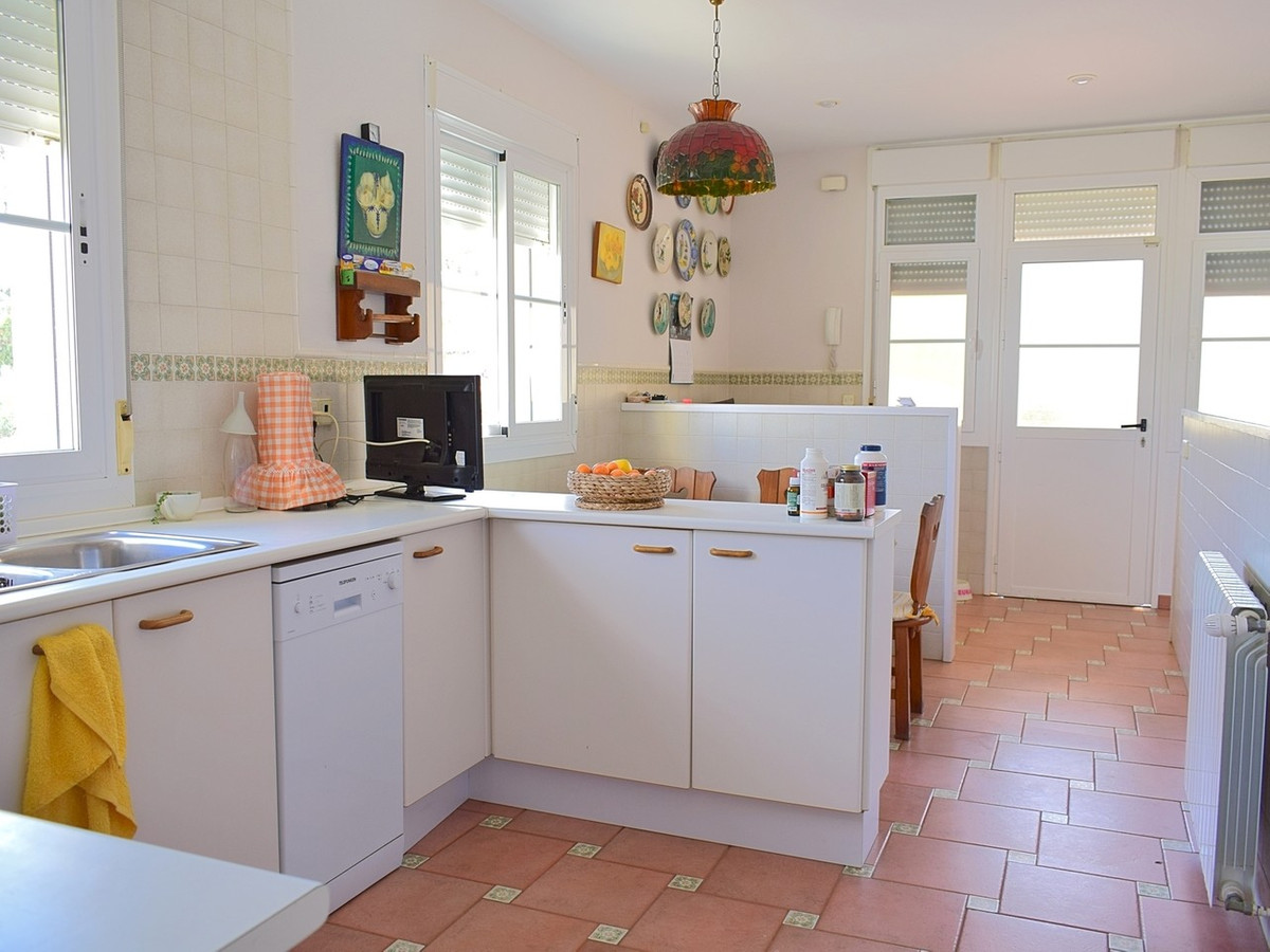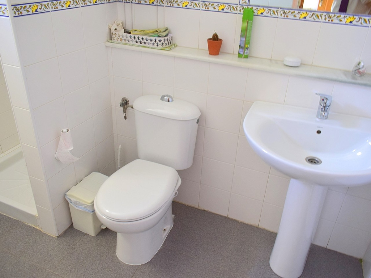 The main entrance of the property, located on the upper floor of the property due to the terrain and the way the property has been constructed, leads directly into the kitchen. This is a bright, open-plan room consisting of both kitchen and dining spaces, with abundant cupboard space on offer thanks to both wall and base units, plus most appliances and a handy breakfast table. The staircase leading to the lower floor of the property leads off of this room. The property boasts a very unique style since the rooms upper floor has been designed around a central courtyard, accessed through patio doors on all four sides. Here you will also find the main living space, with a separate dining room being accessed either from the kitchen or this room.