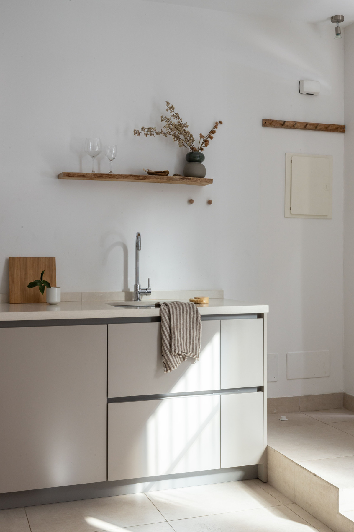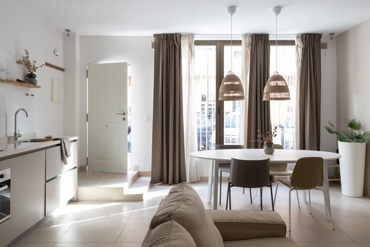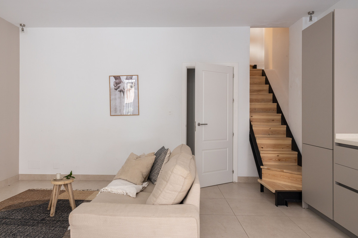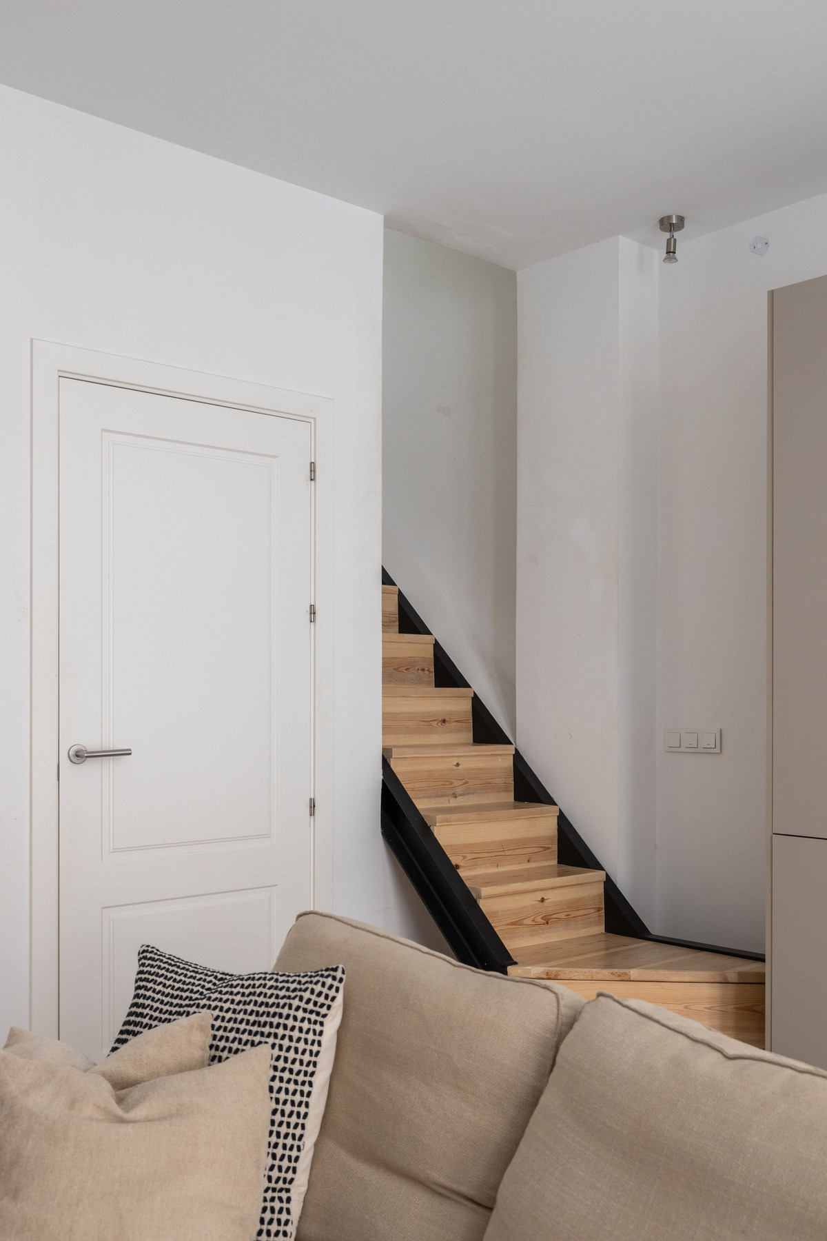 The upper level features a charming bedroom with soft carpeting and small windows, creating a warm and cozy atmosphere. Despite its central location, the apartment offers a peaceful retreat thanks to its quiet positioning.