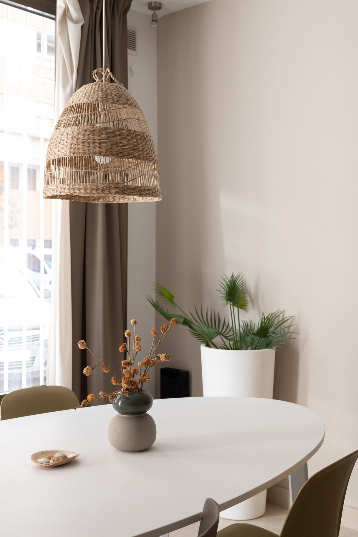 Boasting high ceilings and large windows, the apartment feels spacious and filled with natural light. Upon entering, you're welcomed by a modern and open-plan living space that includes a stylish kitchen, dining area, and a cozy relaxation corner with a sofa and TV. From the living area, you'll find access to a separate toilet, a shower room, and a laundry room for added convenience.