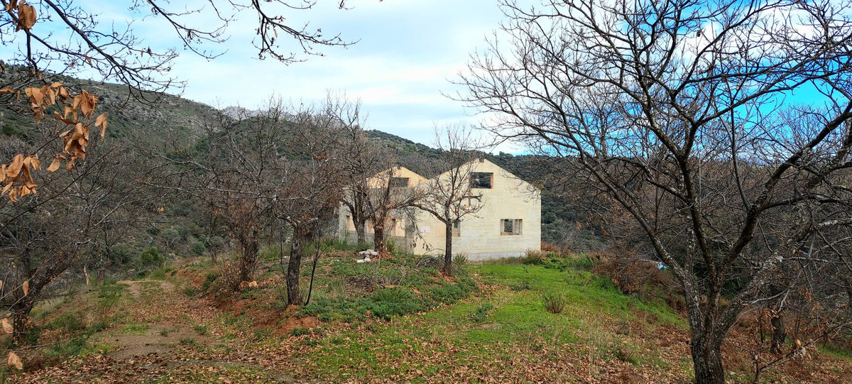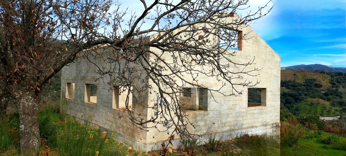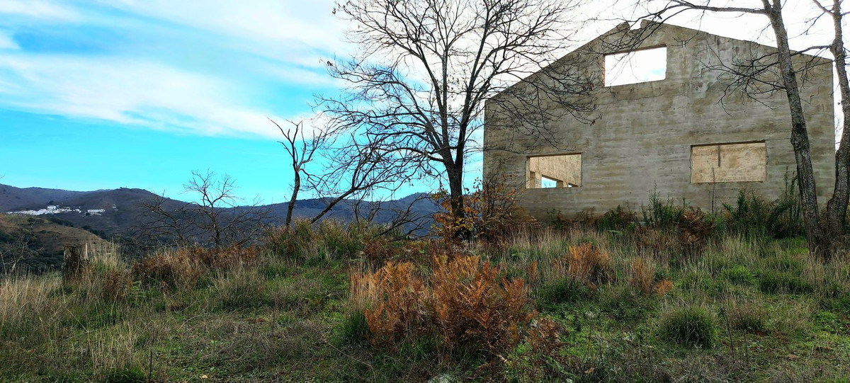 Existing building: high-quality raised concrete base and 80 m² of construction with four walls and large windows, perfect for extending a rural home or developing a custom project with outdoor space. The land in this area is completely flat and usable.