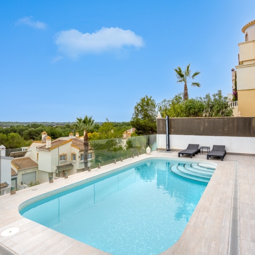 For sale villa in the prestigious Las Ramblas Golf area, offering a blend of privacy, luxury, and comfort over three beautifully designed floors.On the ground floor, you'll find a self-contained apartment with its own independent entrance, making it an ideal space for guests or even as a rental opportunity. This apartment includes two bedrooms, a fully equipped kitchen, a cosy living area, and a bathroom, providing both privacy and convenience.Moving up to the main level, you'll be greeted by a bright, glazed hall that leads into an open-plan lounge area. From here, you can step out onto the terrace, which offers access to a spacious solarium – perfect for enjoying the sunny days and breathtaking views. The open-plan kitchen is ideal for entertaining, and a charming fireplace adds a touch of warmth to the living space. A convenient WC is also located on this floor.On the middle floor, there are two ensuite bedrooms, both with access to another balcony, offering an intimate retreat with picturesque views and plenty of natural light.The villa boasts a private swimming pool, a BBQ area, and a chill-out zone. The original garage has been cleverly converted into a stylish bar area, perfect for relaxing or entertaining guests in a relaxed atmosphere.
