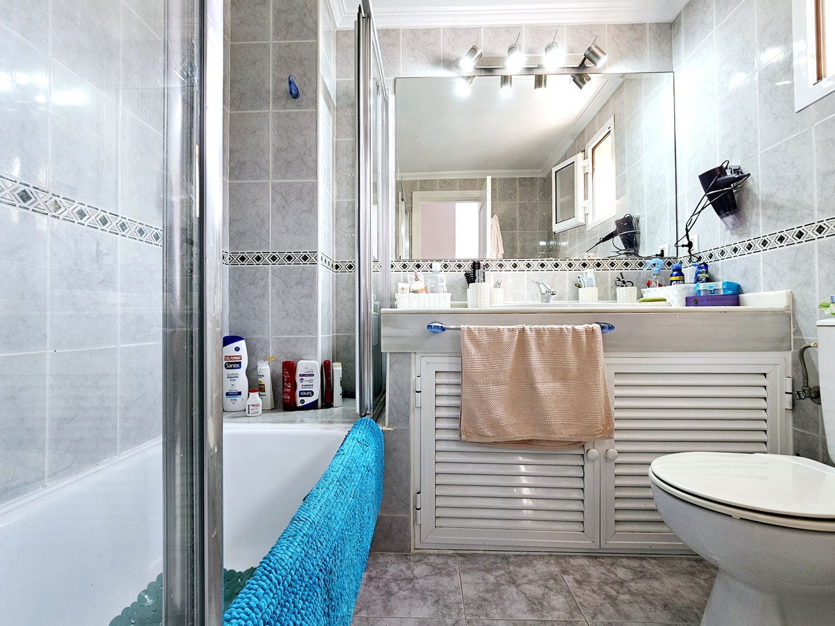 Ejendommen er tilgået via en attraktiv andalusisk stil veranda med flotte fliser og potteplanter, der åbner op i entré med store skabe. Til venstre er det fuldt udstyret køkken med separat bryggers og gæstebadeværelse. Et par trin ned fører dig ind i den store stue, spisestue med en praktisk bar for dem, der kan lide at underholde, og dette fører direkte ud til den store terrasse med smukke andalusiske fliser og farverige planter. Der er plads nok på denne terrasse til familiespisning og et afslapningsområde. En port for enden af terrassen fører dig til de fælles haver og swimmingpool med direkte adgang til stranden.