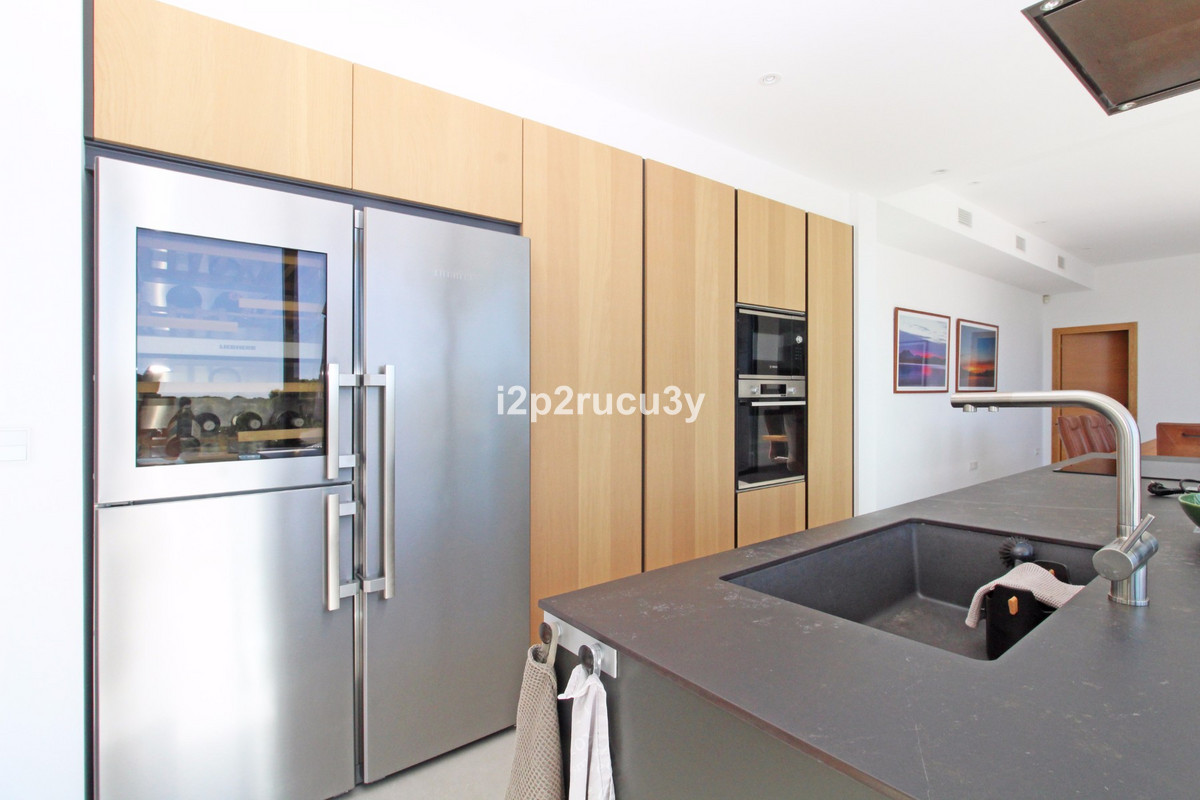 Upon entering, you are greeted by a spacious hallway that leads into a large open-plan living and dining area, designed to create a bright and airy atmosphere. The stylish, contemporary kitchen is equipped with a central island and all the amenities a cooking enthusiast could desire. Large sliding glass doors provide access to a covered summer kitchen, ideal for outdoor dining and cooking. From the kitchen and living room, you step directly onto the expansive sun terrace, where you can enjoy a heated pool and a generous poolside area with an outdoor shower. This is the perfect spot to relax and enjoy the Mediterranean lifestyle, or to entertain friends and family with a poolside gathering.