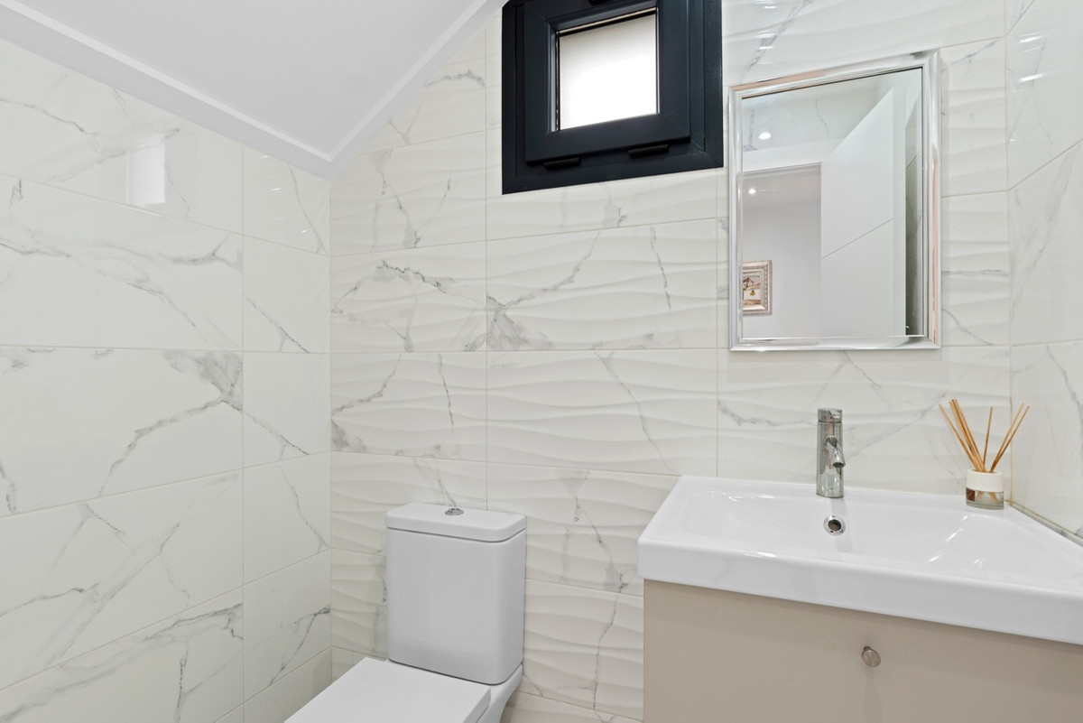 This stunning villa features 3 spacious and bright bedrooms on the upper floor, each with an en-suite bathroom and large windows that allow you to enjoy the beauty of the natural surroundings. Two of the bedrooms have direct access to a private terrace, offering privacy and comfort. Additionally, there is a guest toilet on the first floor for the convenience of residents and their visitors.