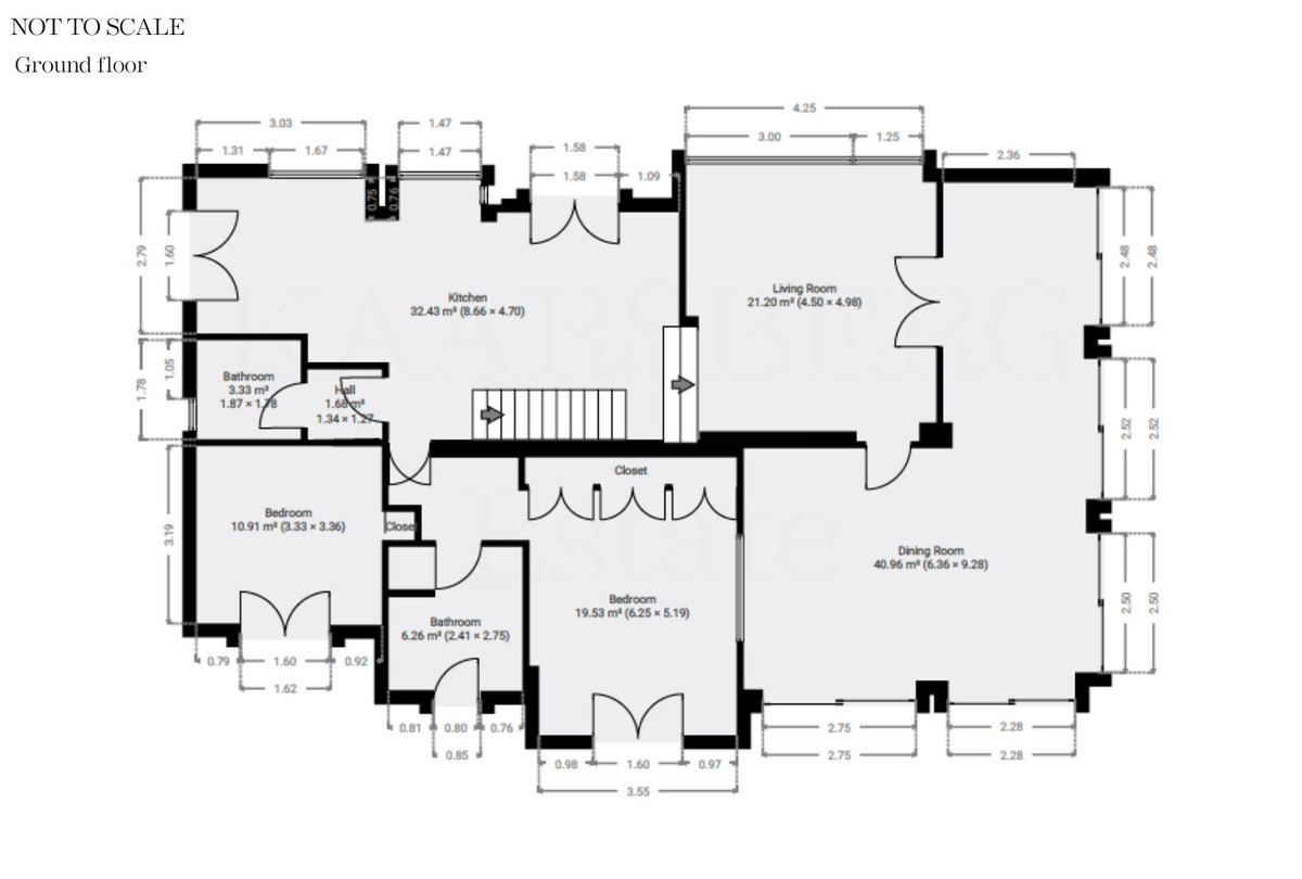 Stueetagen byder på et åbent køkken og opholdsområde, hvor lys og rummelighed er i centrum. Her finder du også to soveværelser, hver med eget badeværelse – ideelt til familie eller gæster.