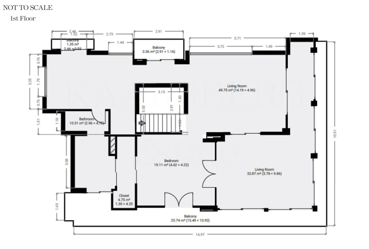 Første sal indeholder en rummelig stue, et soveværelse med walk-in-closet og et luksuriøst en-suite badeværelse. Skabet fungerer som en "skjult dør" til badeværelset.
