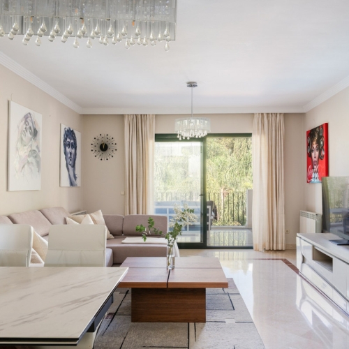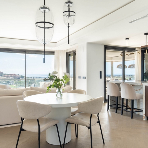 Step into luxury with this newly renovated 2-bedroom, 2-bathroom middle-floor apartment in the heart of Nueva Andalucía. Designed for modern living, it features a state-of-the-art Gaggenau kitchen, elegant herringbone wood flooring, and a spacious southwest-facing terrace offering breathtaking panoramic views.