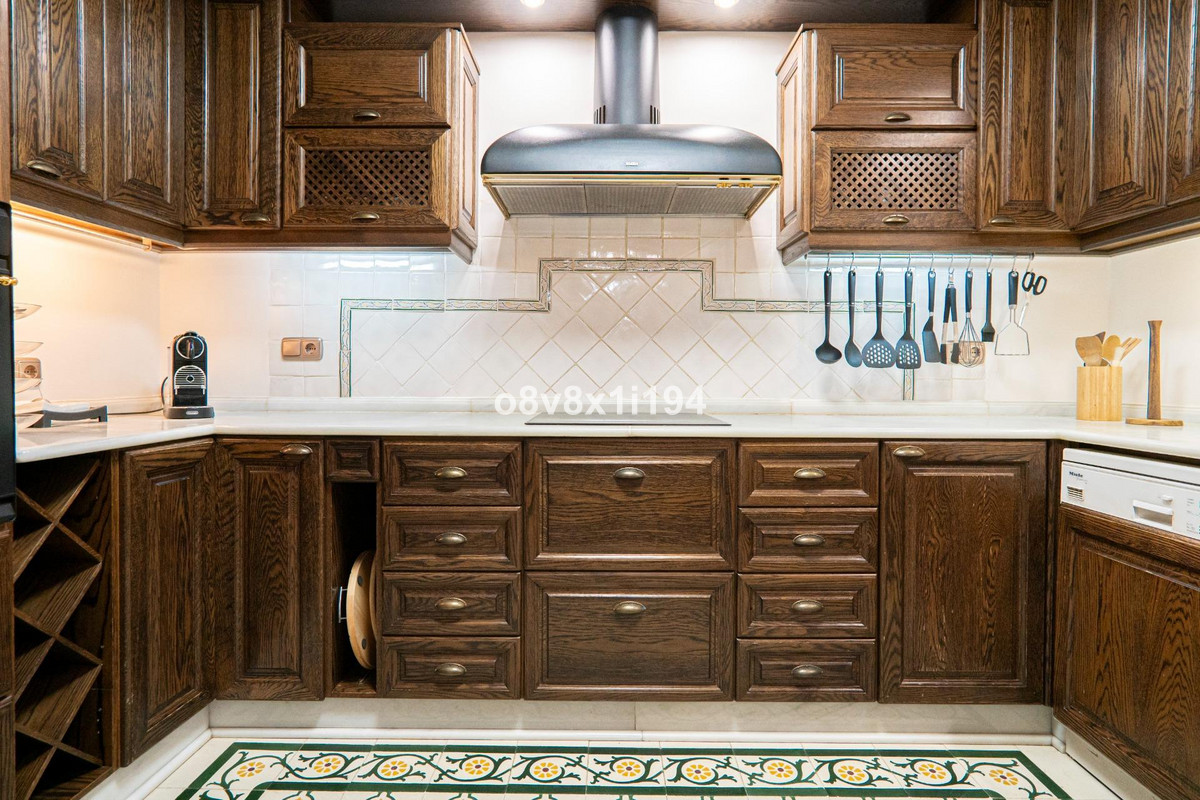 Oak wood kitchen equipped with Macael marble countertop and sink.